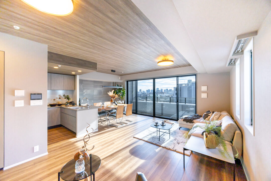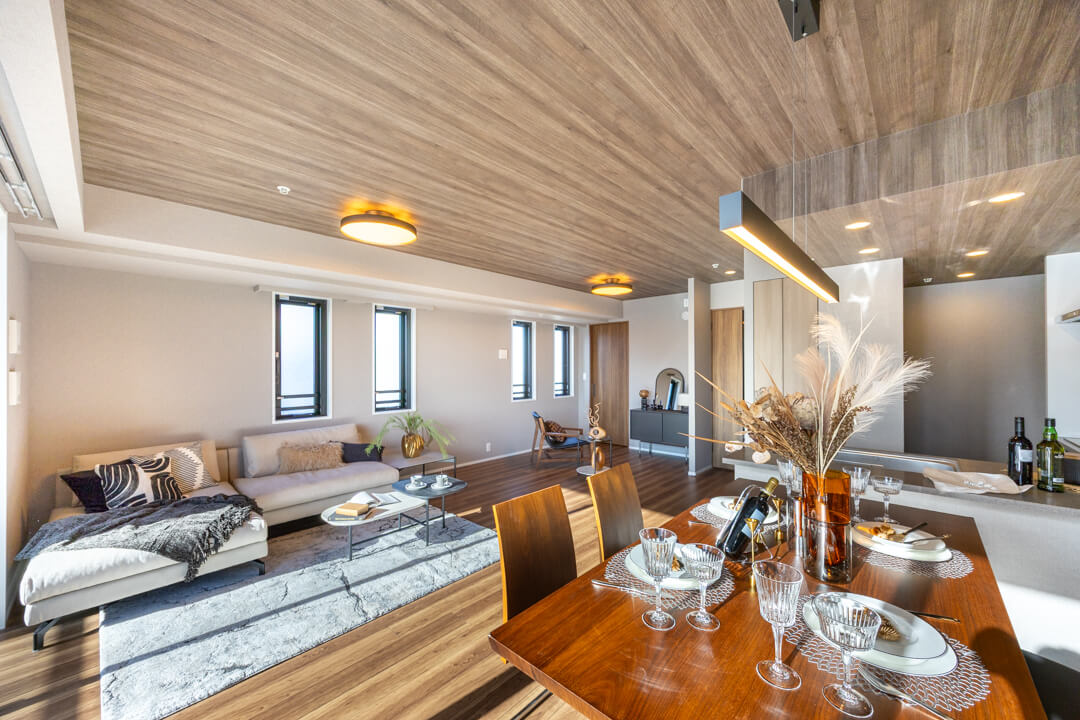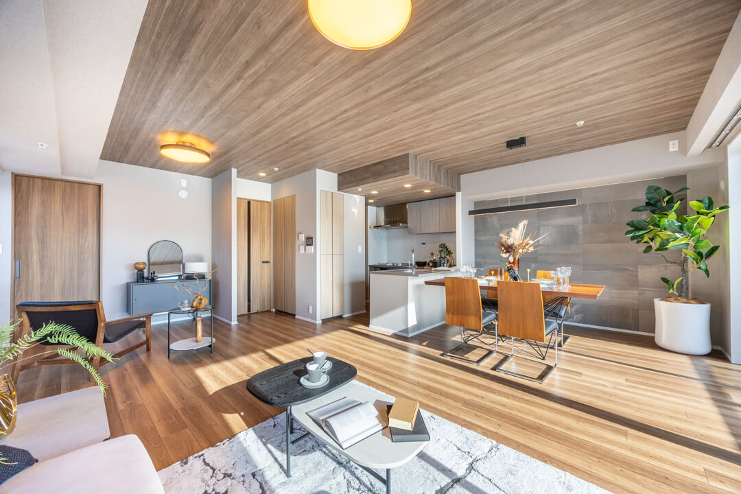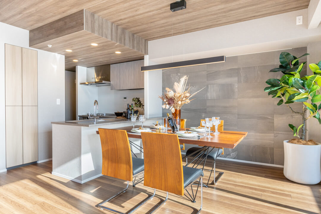 約20.4帖の広々としたリビングダイニングです。木目柄がふんだんにあしらわれていて、ナチュラルかつ上質な雰囲気が漂っています。グレーのストーン調のアクセントウォールも◎。また、二面採光で南東向きのため日当たりも良好です。