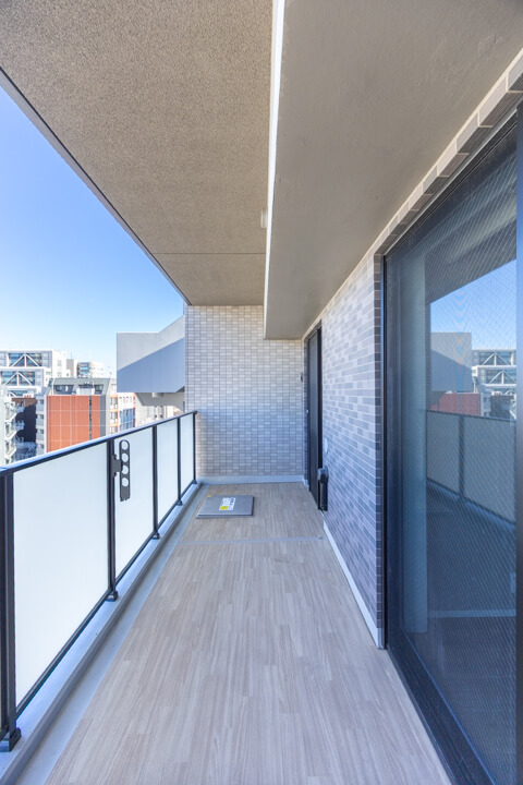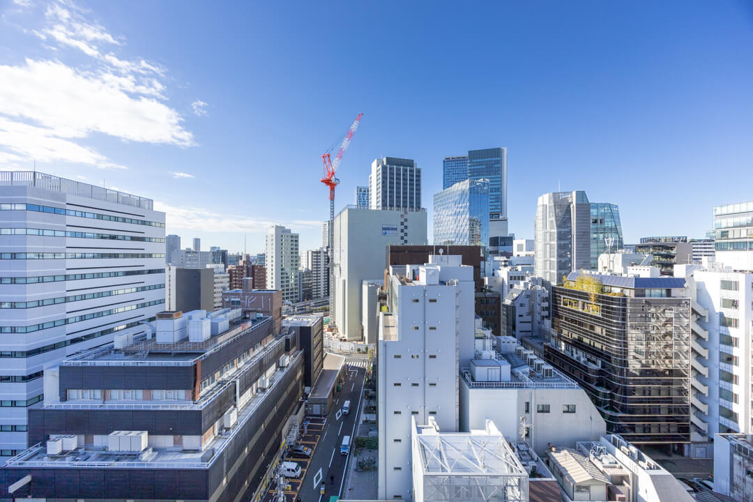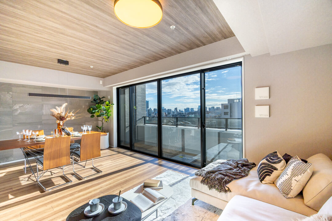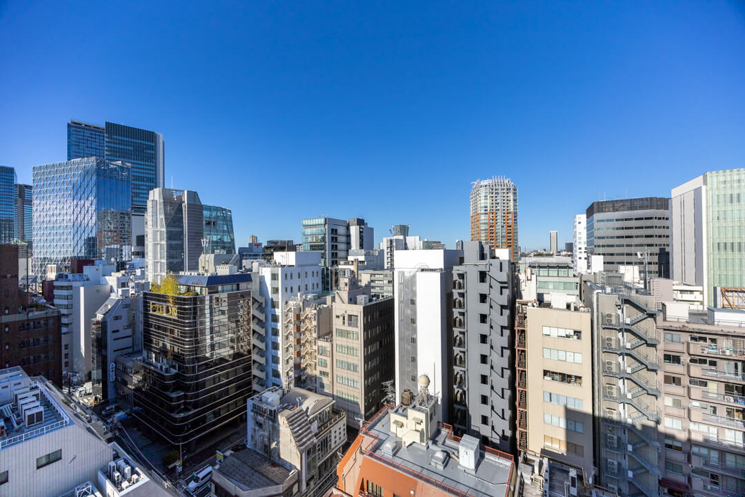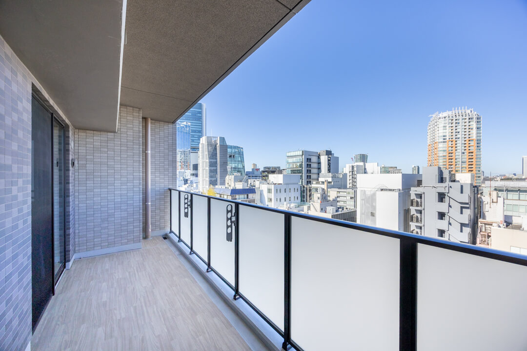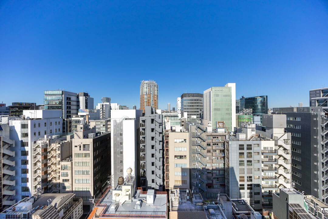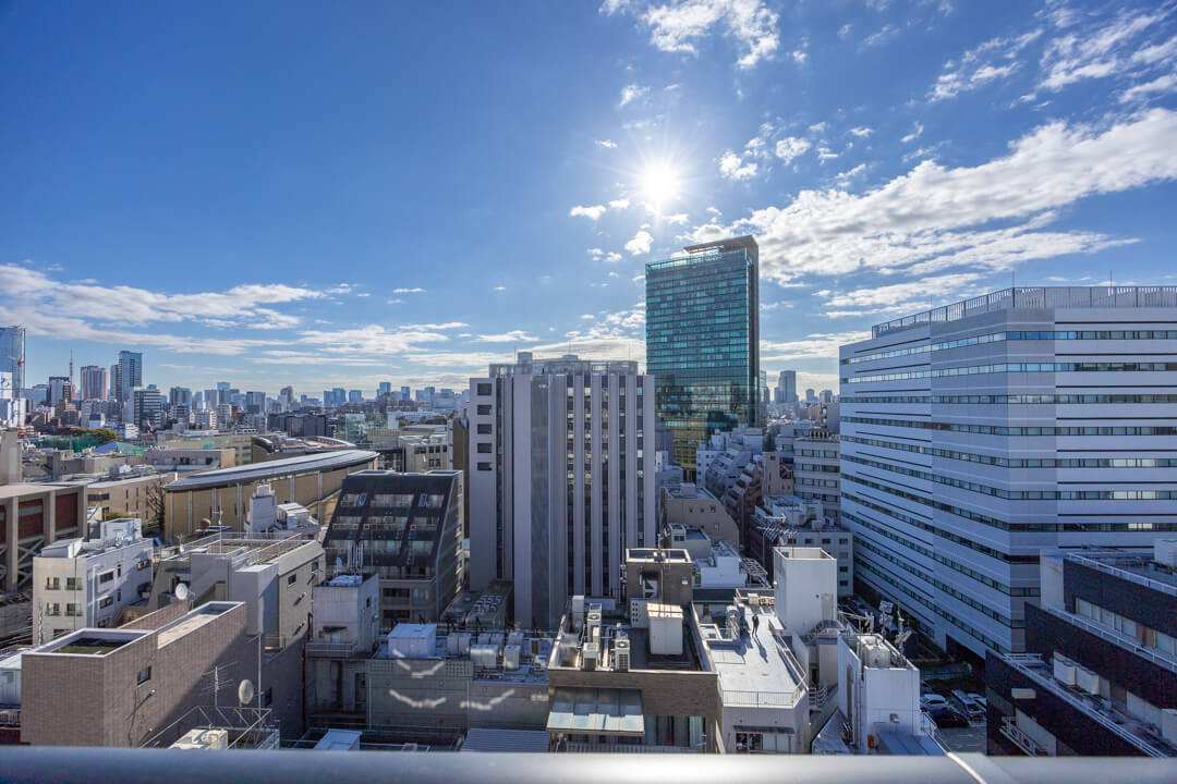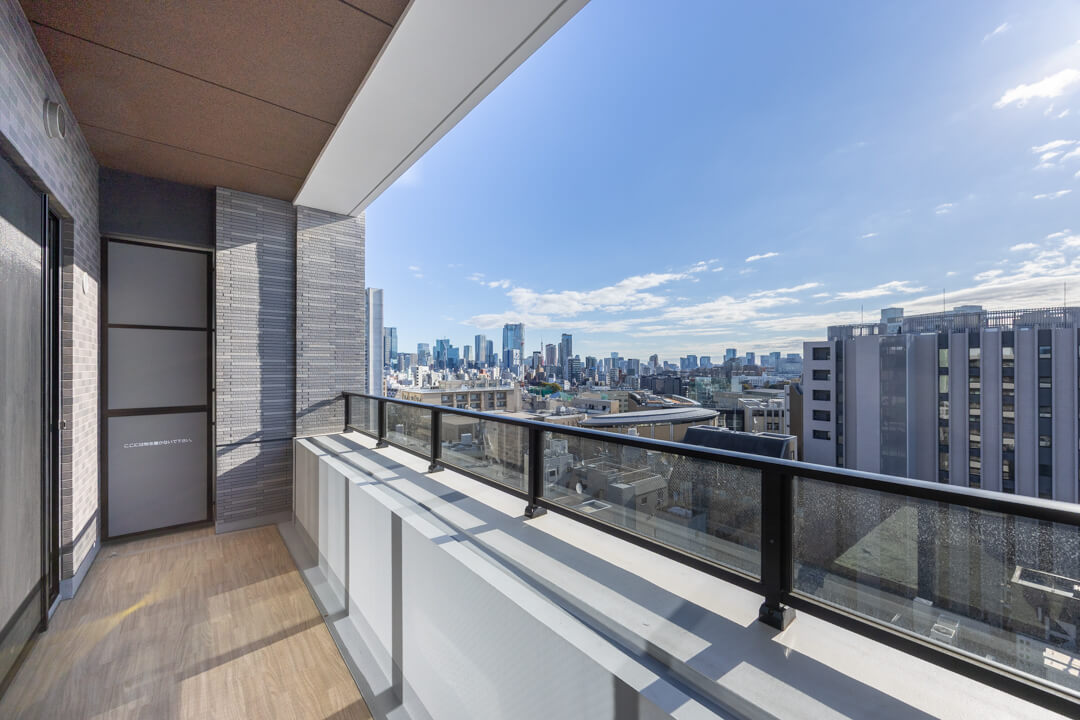 窓からは南東側のバルコニーにアクセスができます。14階部分で最上階のため、目の前には開放的な眺望が広がっています。遠くの空には東京タワーも!夜には都心の夜景も堪能できそうです。