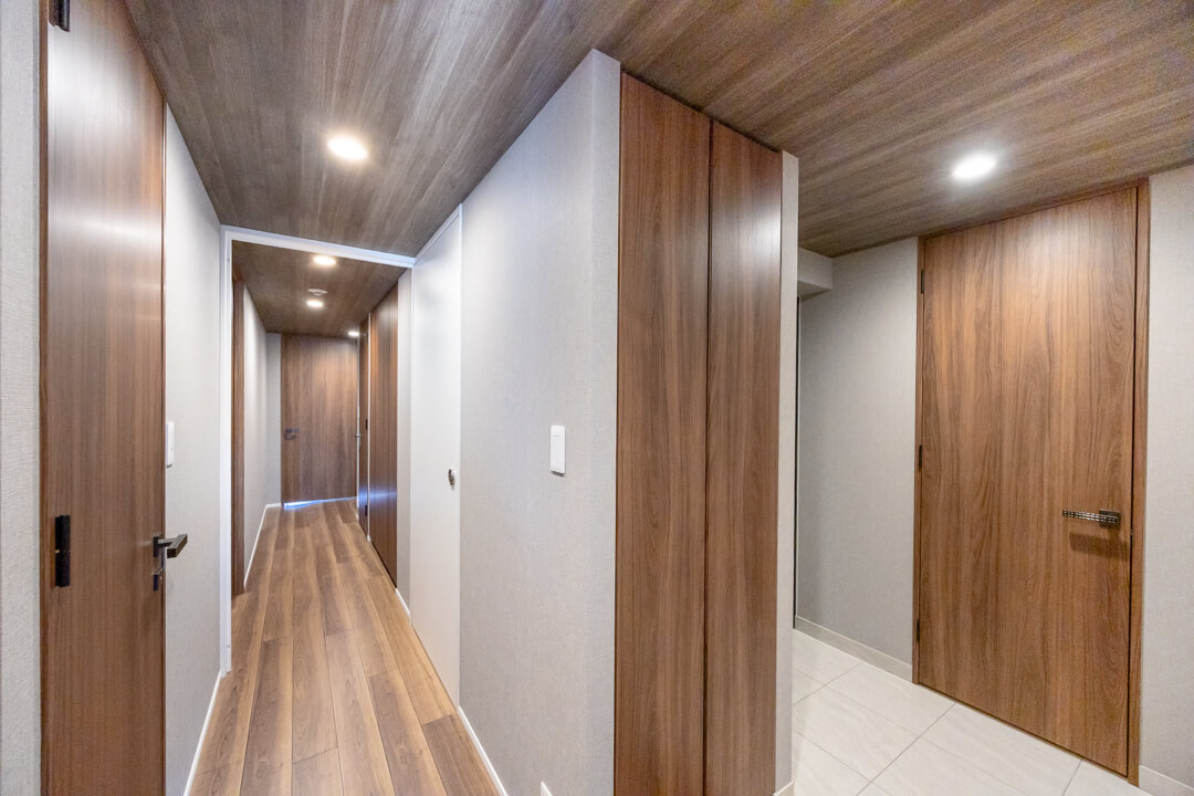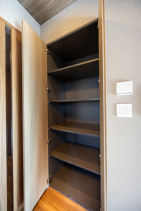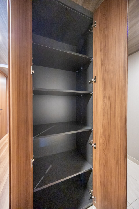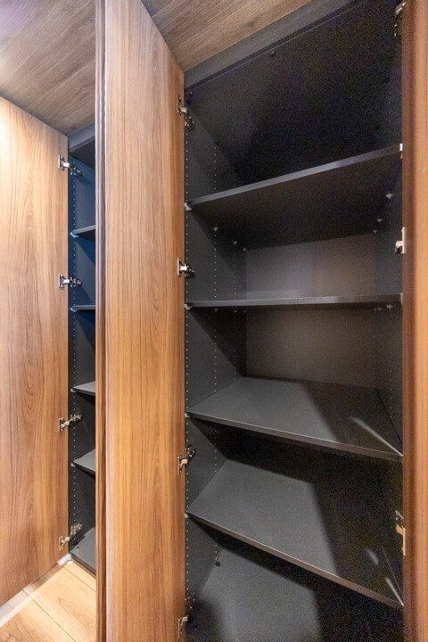 玄関入って左側にはシューズインクローゼットが造られています。中には可動棚が設置されているので、持っている靴に合わせて調節が可能です。さらに、廊下には3個も収納棚が造られています。