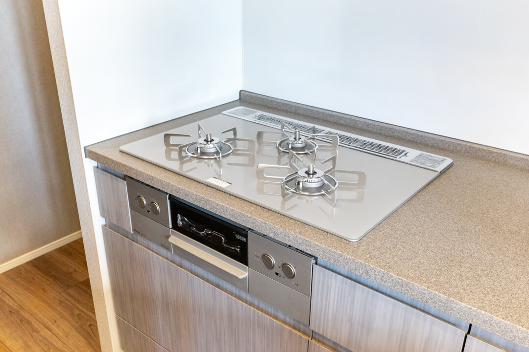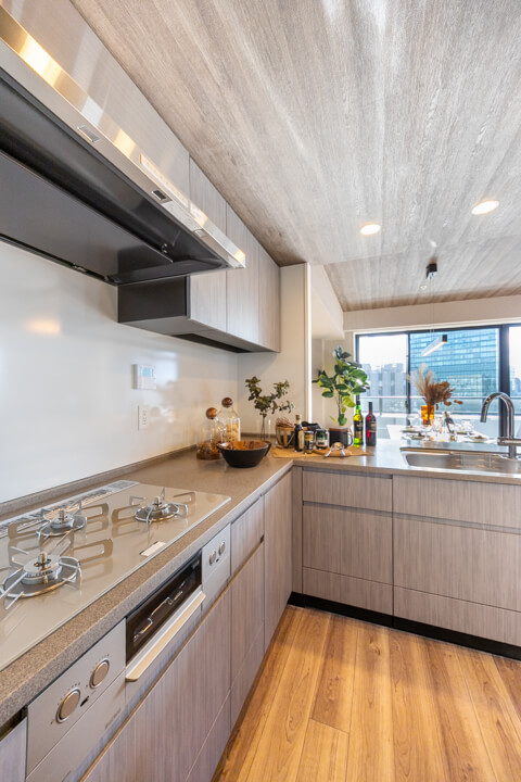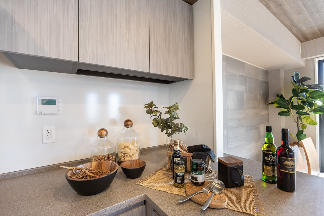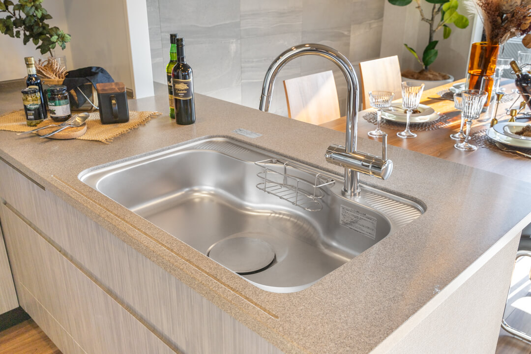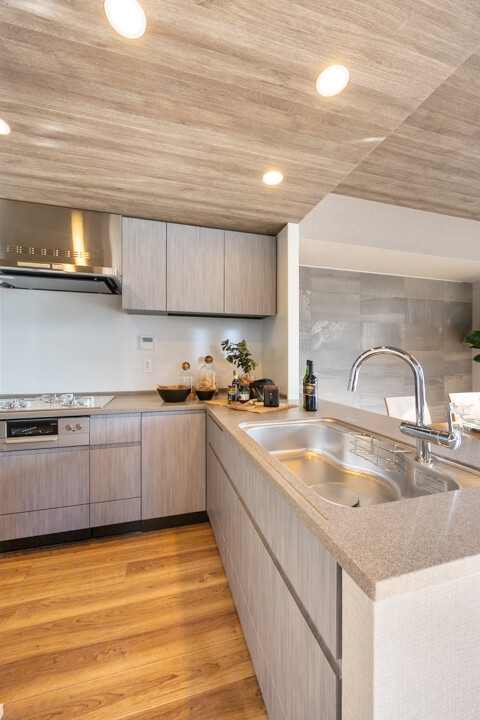 キッチンは、動線が最小限に済んで料理が捗るL型です。作業スペースや収納スペースも広めに取れて◎。冷蔵庫置場は奥にあるので、リビングダイニングから見えにくいのも嬉しいポイントです。また、対面式のため家族や来客とのコミュニケーションも取りやすくなっています。