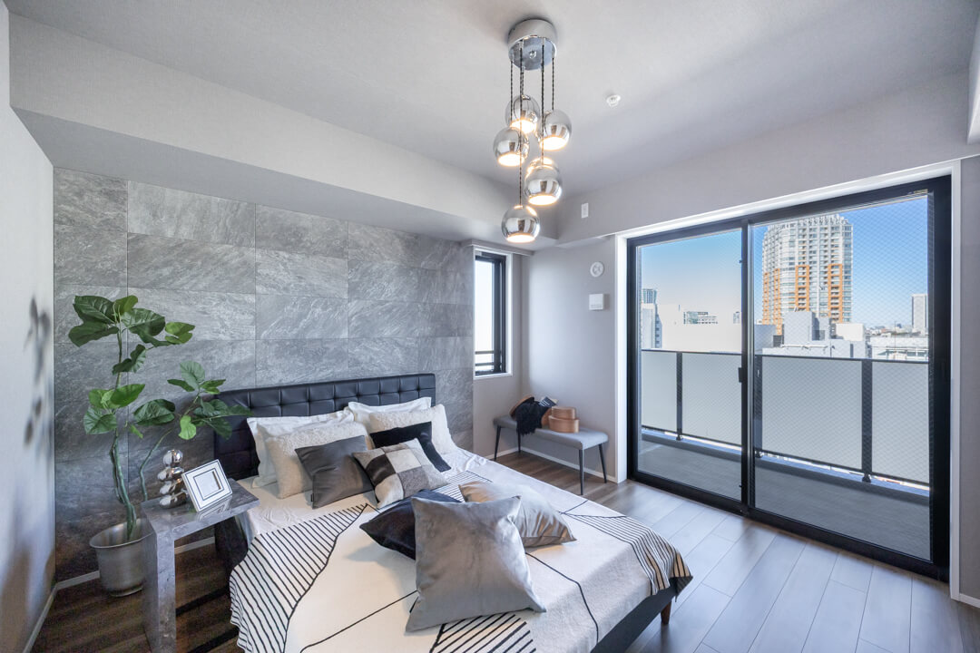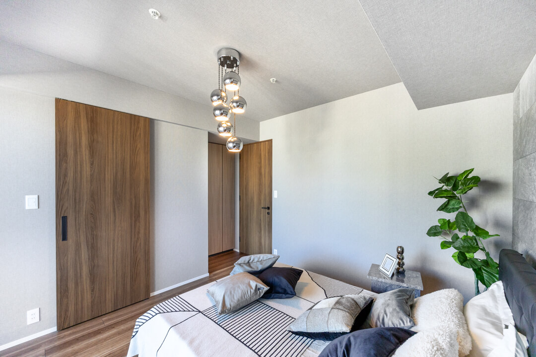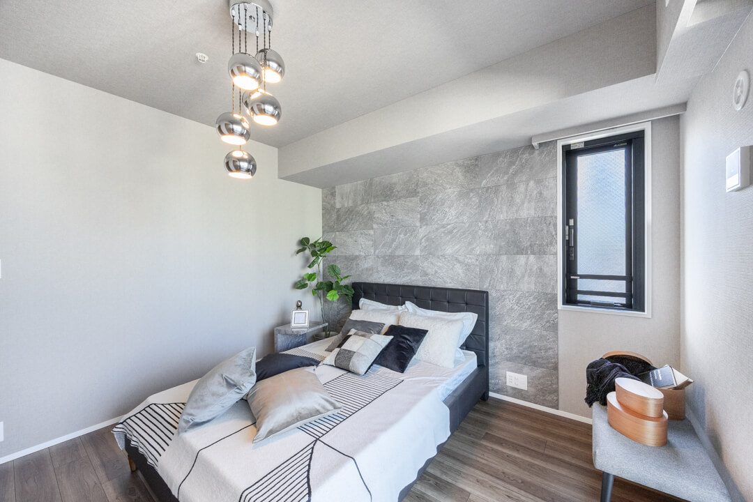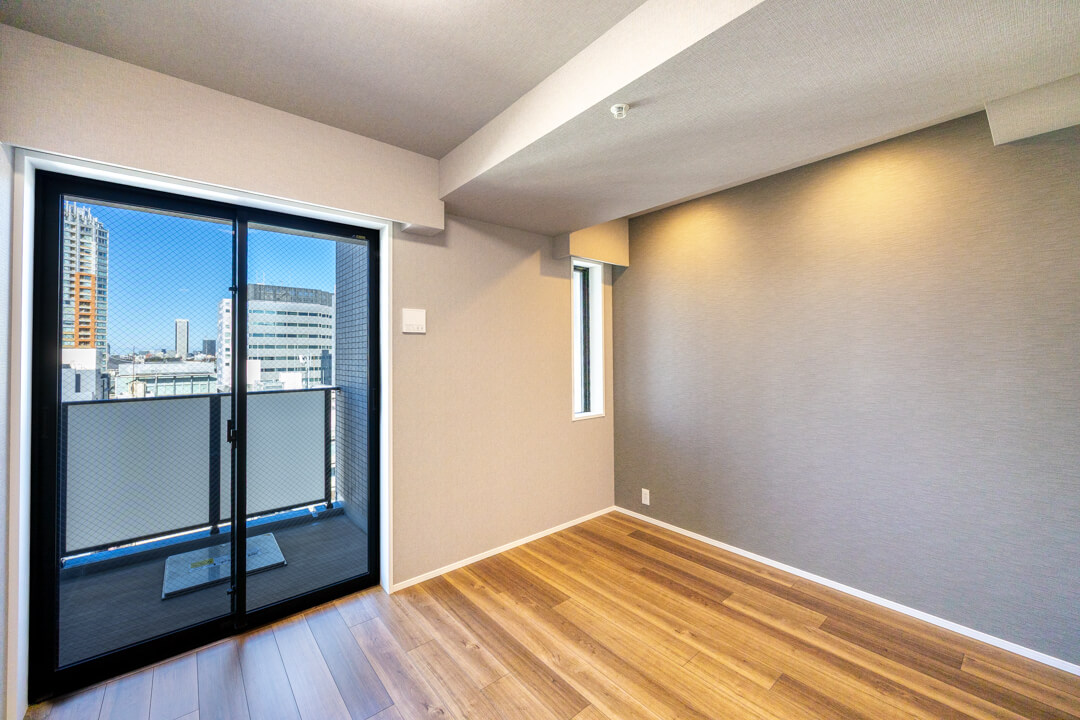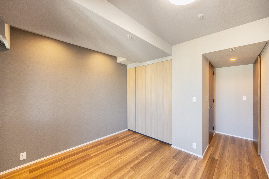 約8.0帖の洋室1は、ゆとりがあって主寝室に良さそうなお部屋です。クローゼットだけでなく、ウォークインクローゼットも造られているので、荷物をすっきりと収納することができますよ。グレートーンのアクセントクロスで洗練された雰囲気なのも◎。窓からは北西側のバルコニーにアクセスができます。