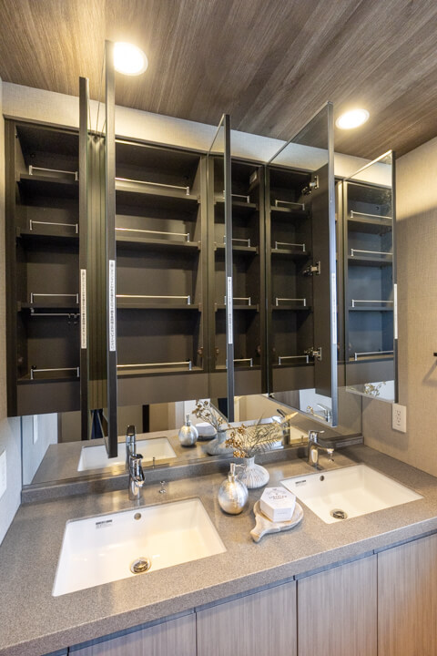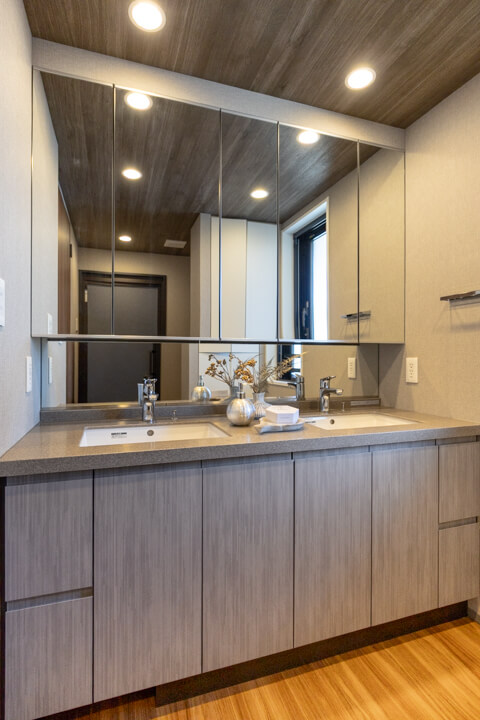 ホテルライクな2ボウル洗面の化粧台です。忙しい朝でも並んで支度ができるので嬉しいですね。また、大きなミラーボックスの中には化粧品が収納できて使い勝手良好。背面側には棚が造られているので、ごちゃごちゃしがちな洗面まわりもきちんと整頓できます。窓があるのも換気がしやすくて◎。