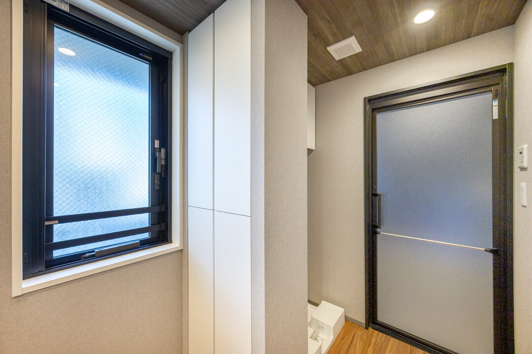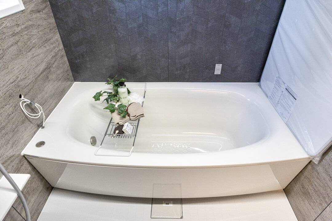 重厚感のあるバスルームには窓があって自然換気がしやすそうです。浴室乾燥機には暖房・乾燥・換気・涼風の機能がついており、一年中快適に過ごせます。また、照明はスイッチ一つで切り替えることができるので、その日の気分に合わせて浴室の雰囲気を変えることができますよ。
