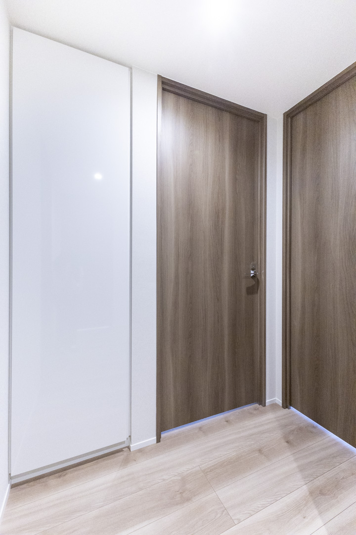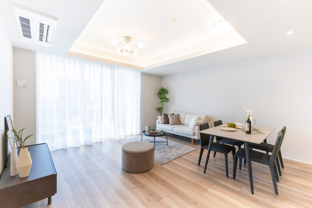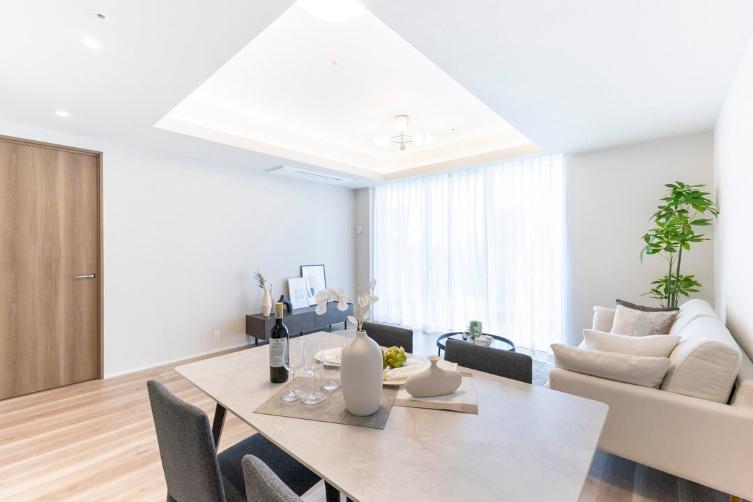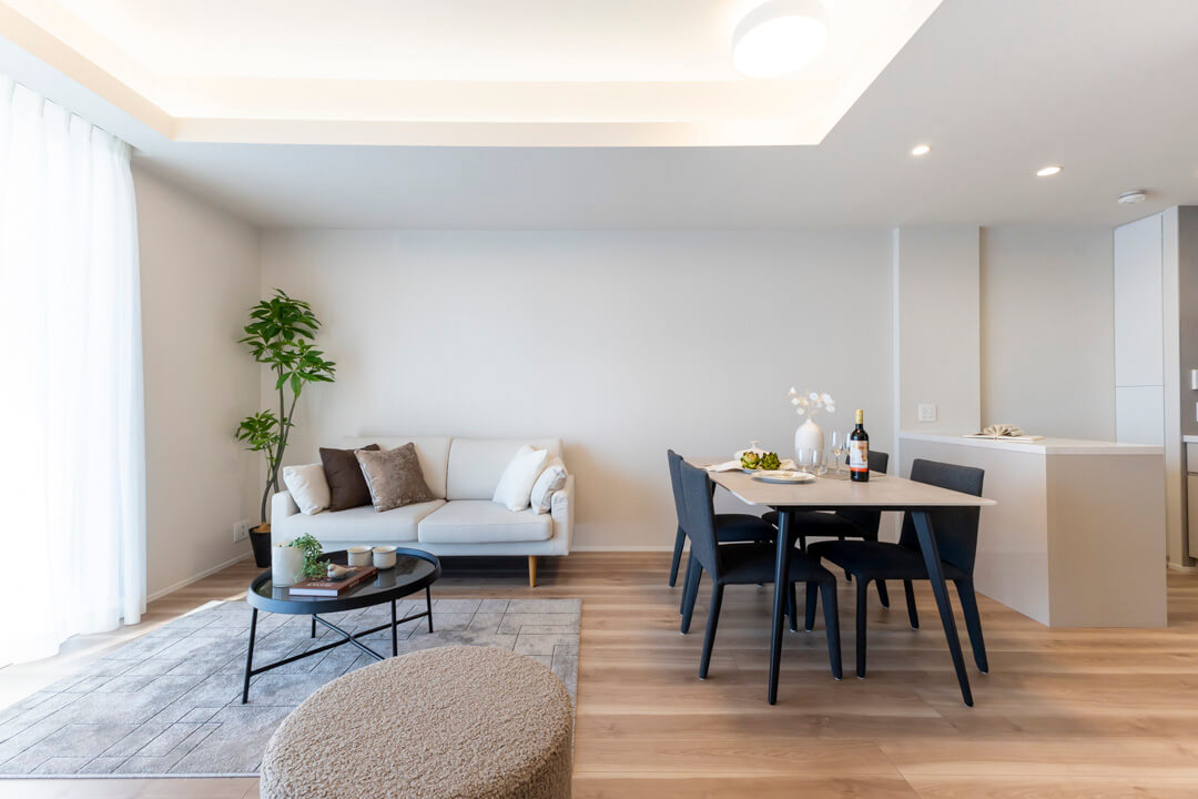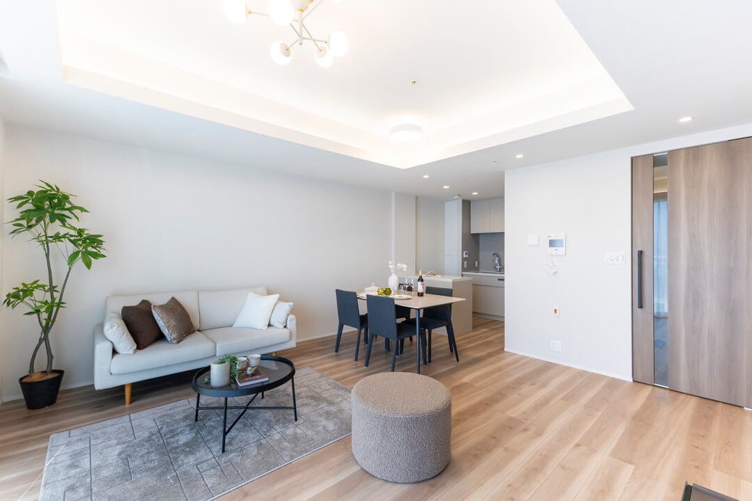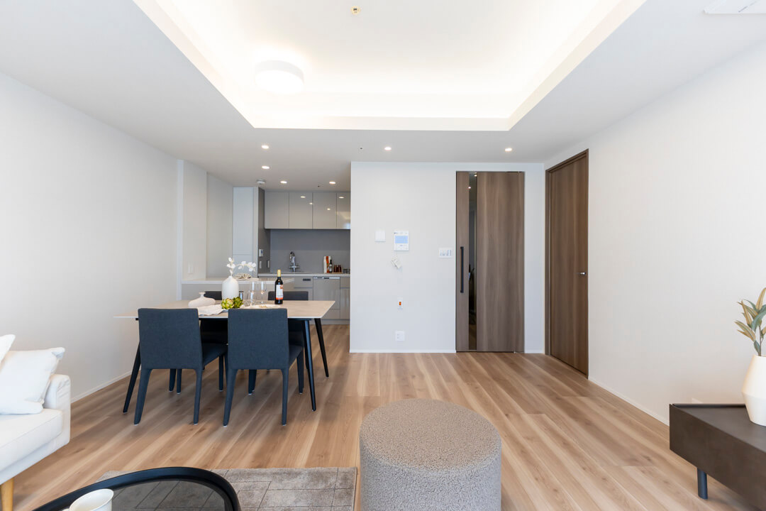 木目の美しさが際立つフローリングと建具を採用した、ナチュラルで洗練された内装。折り上げ天井に配された間接照明がやわらかな陰影を添え、空間全体に上品な雰囲気をもたらします。主張しすぎない色調のため、北欧・モダン・シンプルなど、さまざまなテイストの家具と調和しやすく、現在お持ちのインテリアとのコーディネートもしやすいです。
