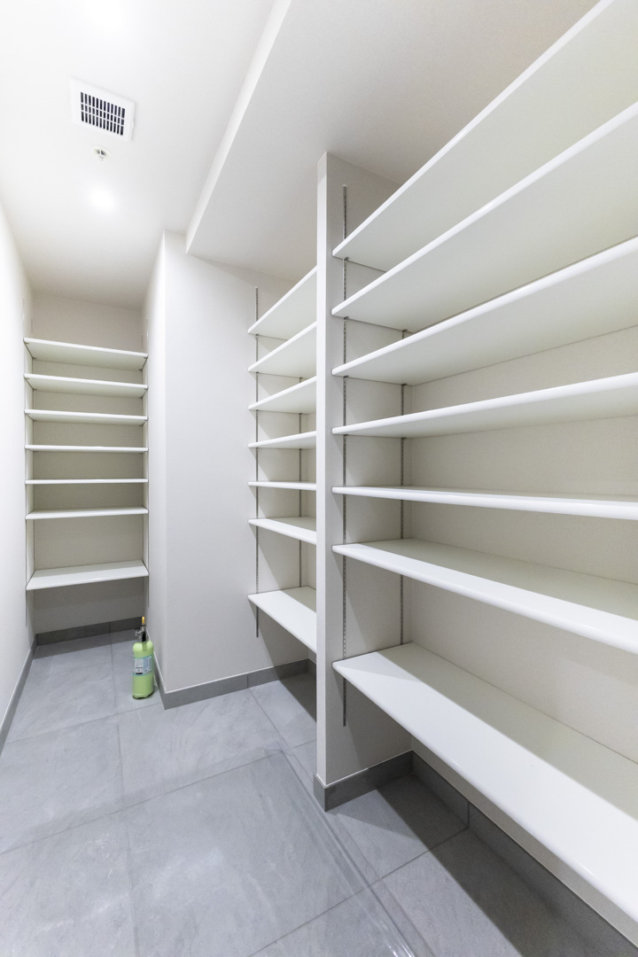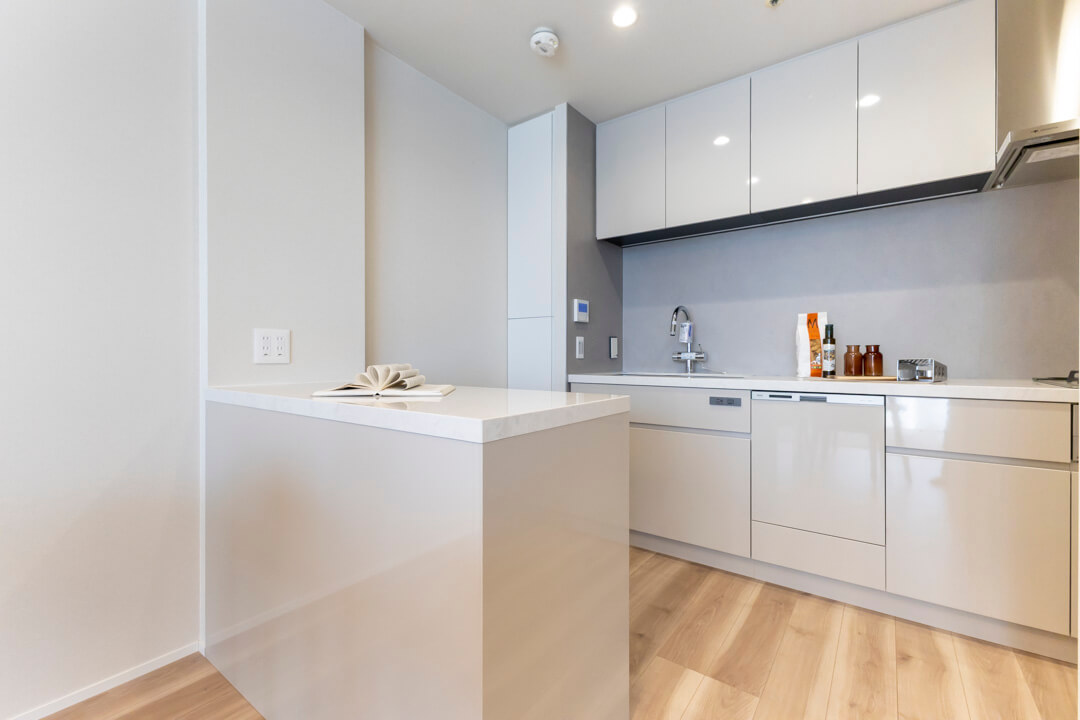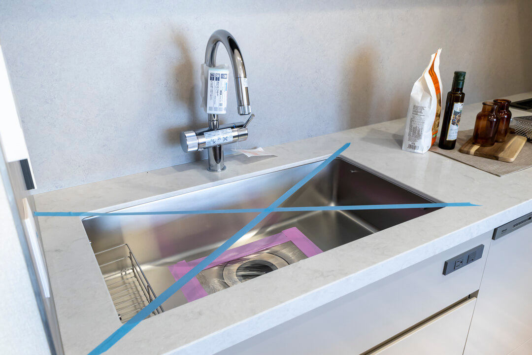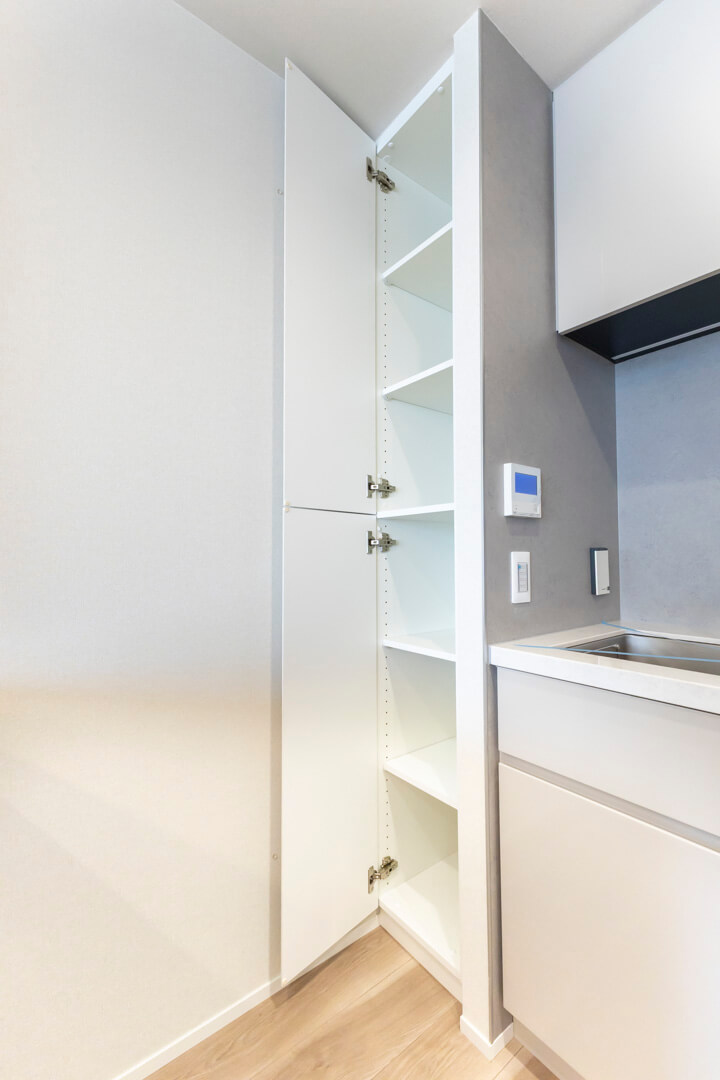 シンク横に可動棚、背面にはカウンター収納を設置。充実の収納力で、散らかりがちなキッチンまわりがすっきり片付きます。カウンター収納は作業スペースとしても使うことができ、複数人で調理したい時に活躍しそうです。