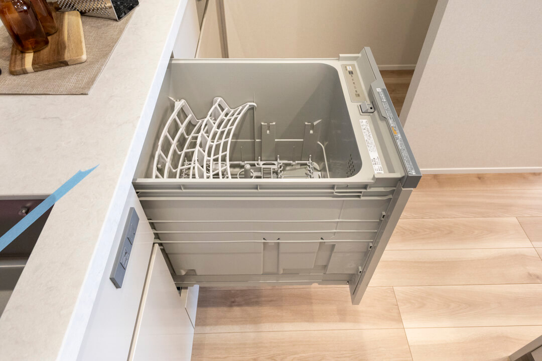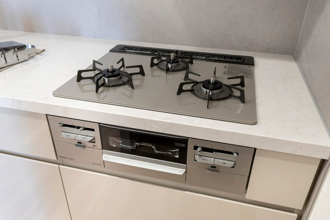 約4.0帖のキッチンスペース。調理に集中しやすい壁付けタイプです。グリル付3口ガスコンロ・食洗機内蔵で調理も後片付けも捗ります。さらに、シンクにはディスポーザーを完備。生ごみ処理の手間が軽減され、悪臭の原因を防いでくれます。カバー付きで安全&スタイリッシュなコンセント完備なのも嬉しいポイントです。