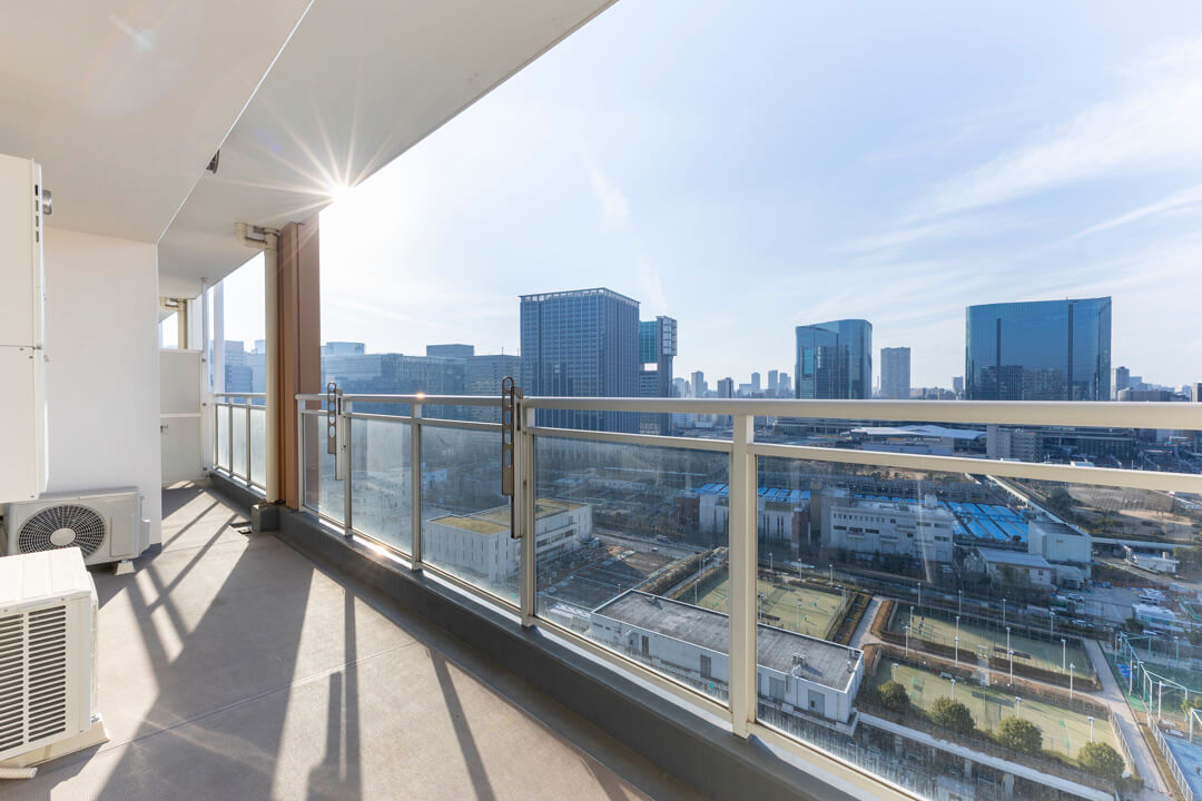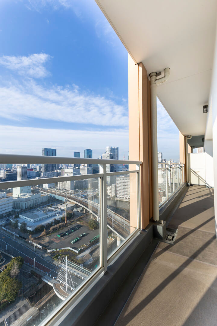 全居室に跨るワイドスパンバルコニー。21.20㎡の広々としたスペースです。明るい光が差し込む西向き、21階部分のため眺望良好◎。北側には東京タワーが見えました(※天候によります)。遠く広がる青空と高浜運河を見渡す開放的な眺めで、ほっとリフレッシュできる場所になりそうです。