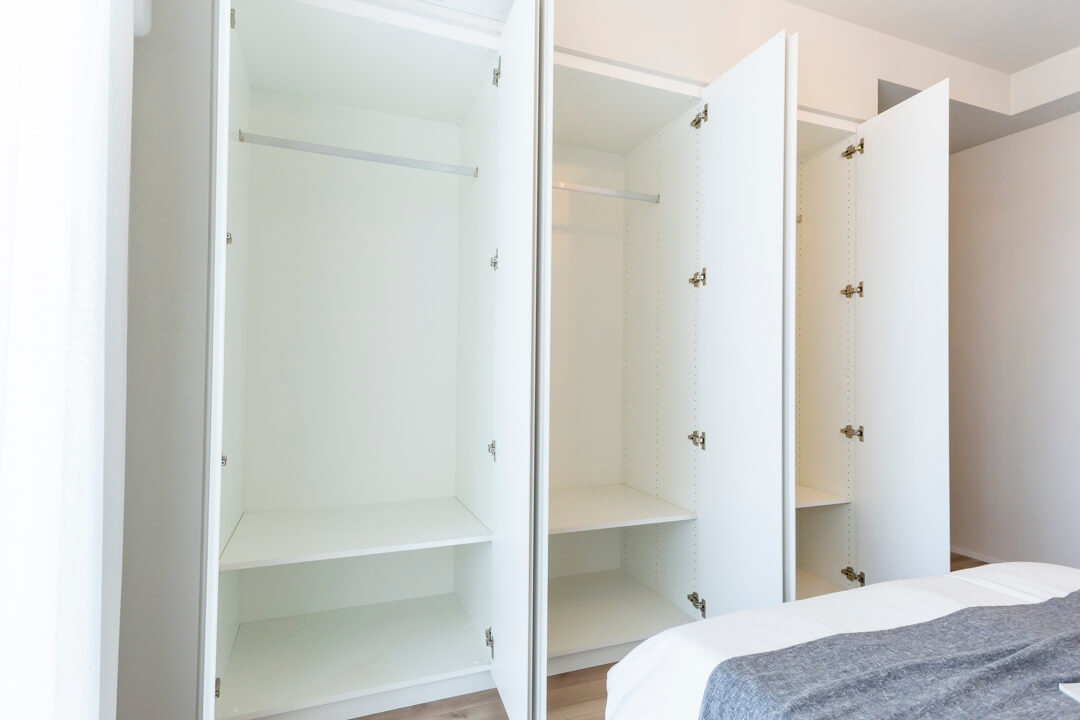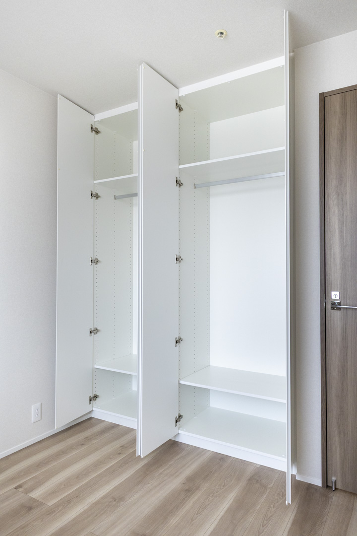 約9.5帖のゆとりある寝室1。バルコニーに面していて、奥行きたっぷりです。クローゼットが3つ並び、収納スペースも充実◎。ハンガーパイプと棚板の高さを調節でき、隅々までたっぷり収納できますよ。お部屋がすっきり片付きそうですね。主寝室にぴったりの空間です。