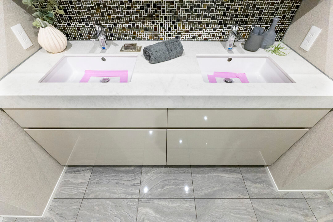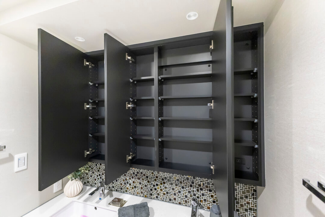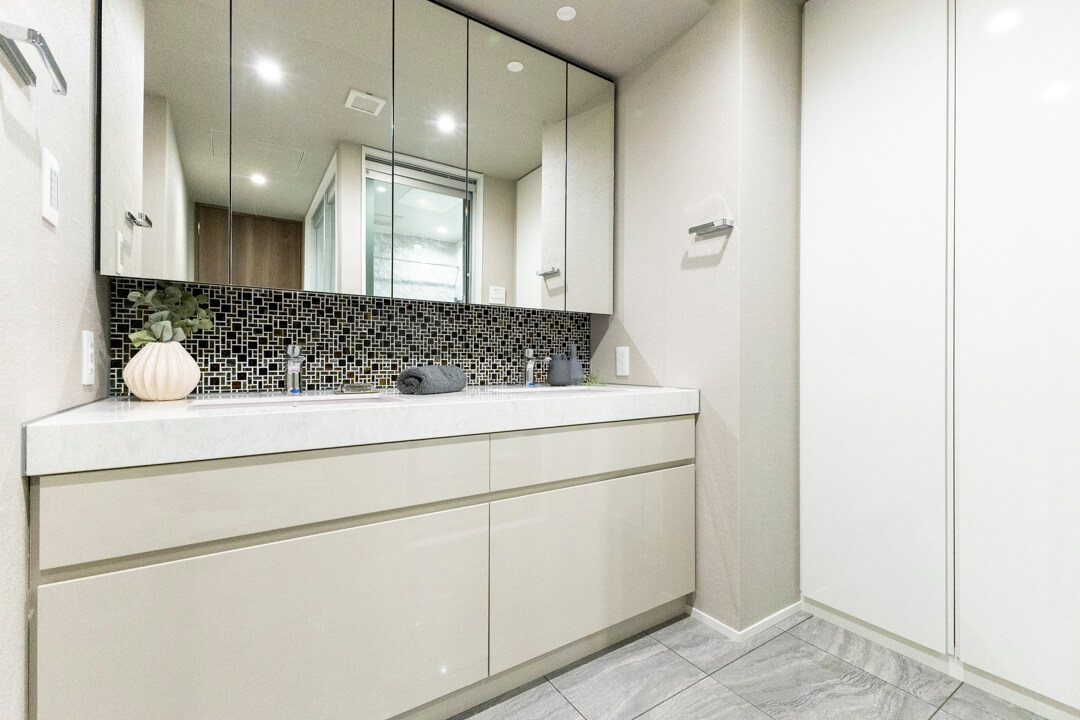 ゆとりある2ボウルタイプの洗面化粧台。2人並んで使用でき、忙しい朝の身支度もスムーズに行えそうです。バックガードのモザイクタイルがホテルライクな雰囲気を演出。洗面台本体の収納に加え、大容量のリネン庫も完備していて、いつも清潔な洗面室をキープできます。