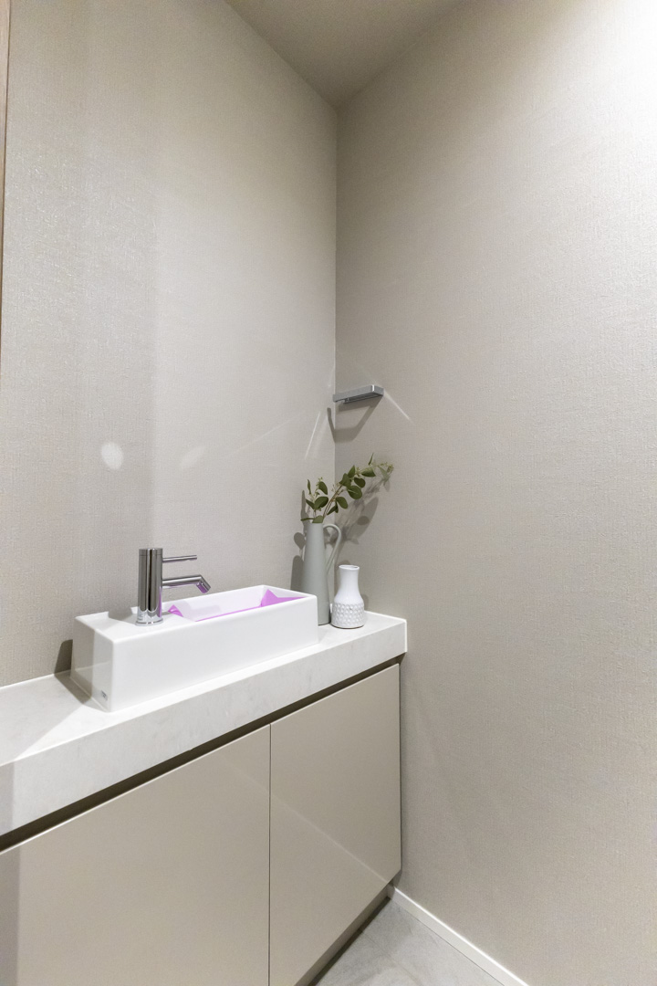 廊下に面していて独立性の高いレストルーム。TOTO製の洗浄機能付トイレに交換済みです。便フタは自動開閉式なので、直接触れることなく使用できて衛生的ですよ。正面には手洗いカウンターを設置。すぐに手を洗うことができ、ゲストを洗面室まで案内する手間もかかりません。