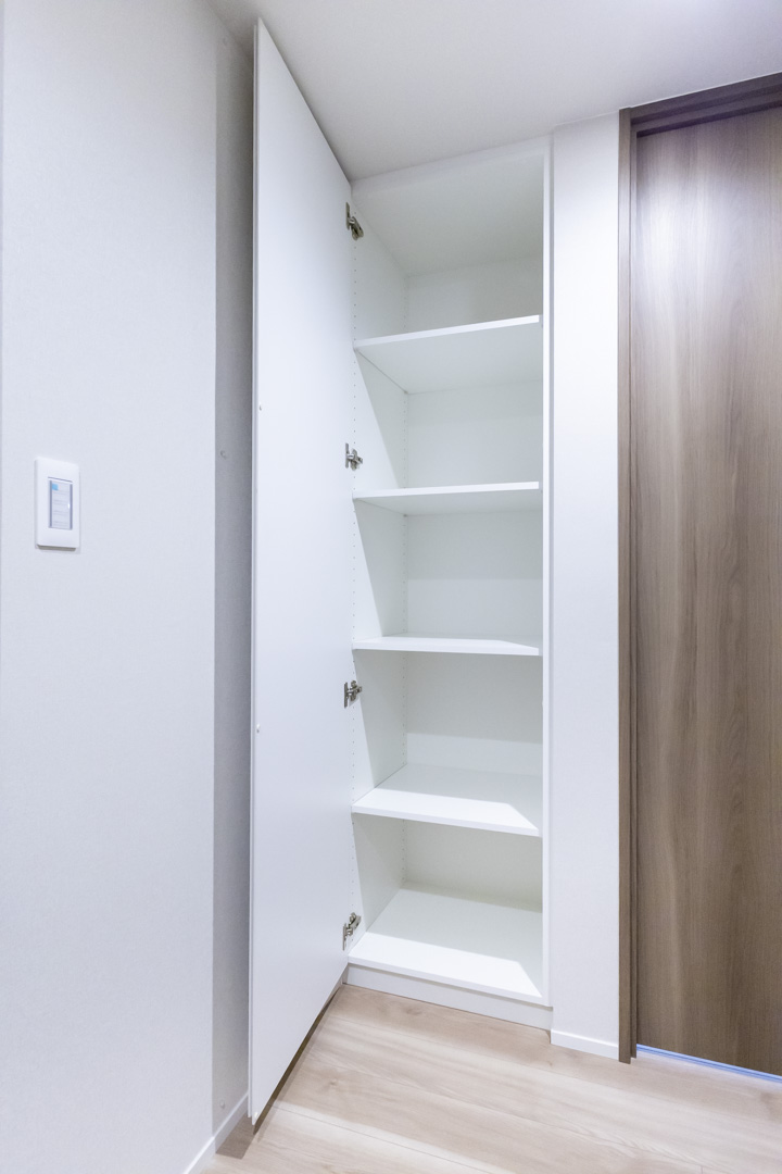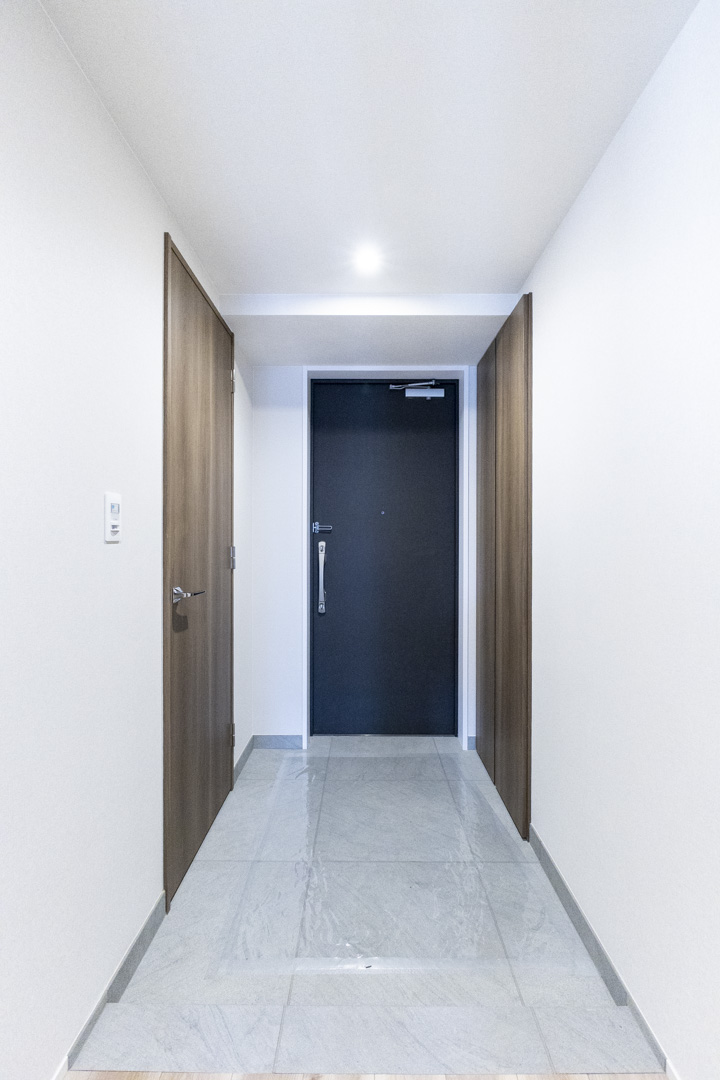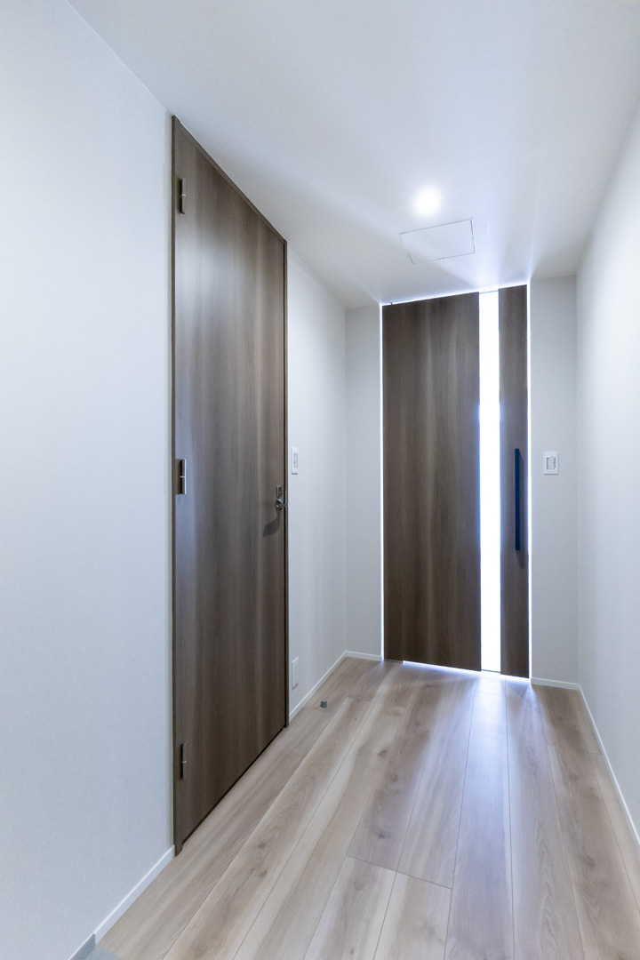 タイルフロアで高級感の漂う玄関。人感センサー搭載でいつも明るく出迎えてくれます。入って右手に約3.0帖のSIC(シューズインクローゼット)、左手に物入があり、収納豊富◎。靴はもちろん、雨具やアウトドアグッズ、ペット用品などもすっきり収納できそうです。寝室側の廊下にも収納があって便利ですね。