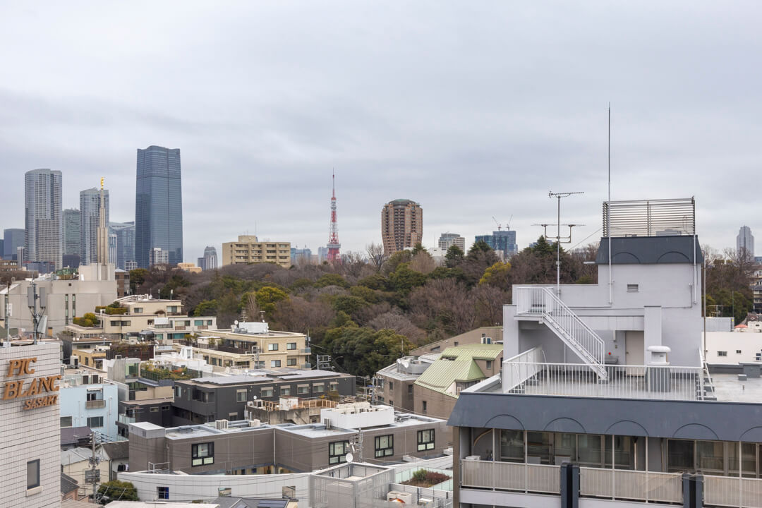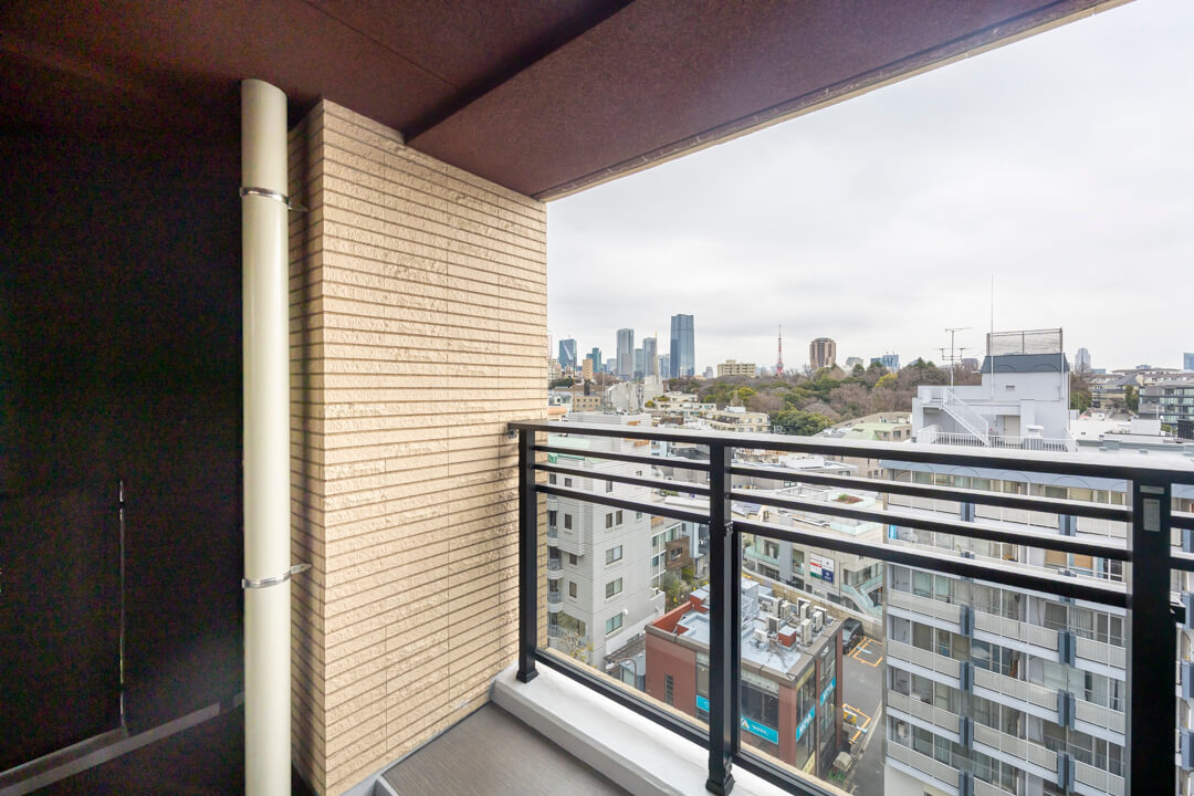リビングダイニングと洋室3に面するバルコニー。5.94㎡です。9階東向きのため、晴れの日には明るい朝日が届きそうです。「東京タワー」や「有栖川記念公園」の緑を望むことができ、季節の移ろいを感じられる眺望。遠く広がる空を見渡し、ほっと一息つける場所になりそうです。