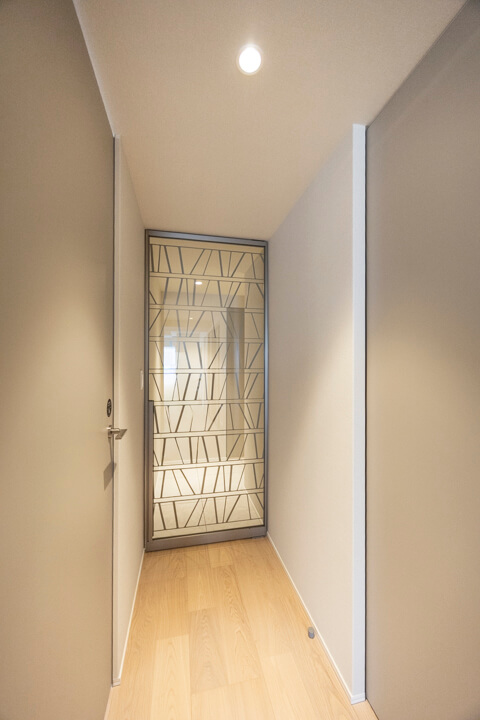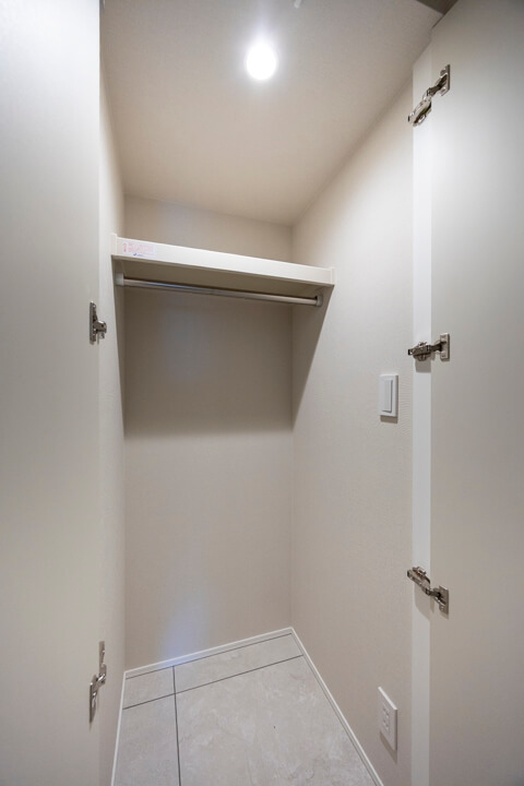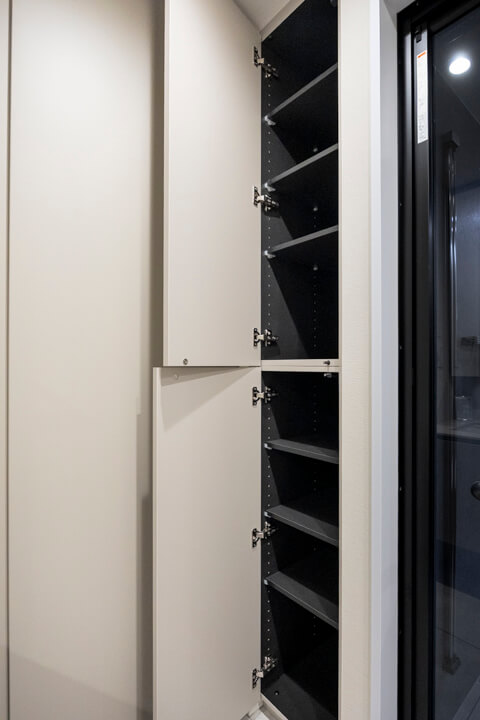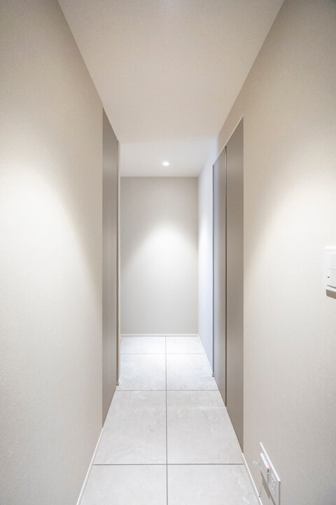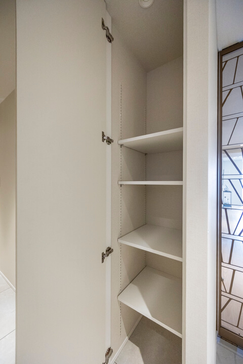 人感センサー搭載でいつも明るく出迎えてくれる玄関。荷物で両手が塞がっている時や夜遅く帰宅した時に、スイッチを探す手間がかからず助かります。SIC(シューズインクローゼット)完備で収納力◎。使い勝手の良い可動棚で、ロングブーツや雨具、アウトドアグッズなども収納できます。廊下にも2つの収納があり、日用品ストックや季節家電の収納におすすめです。