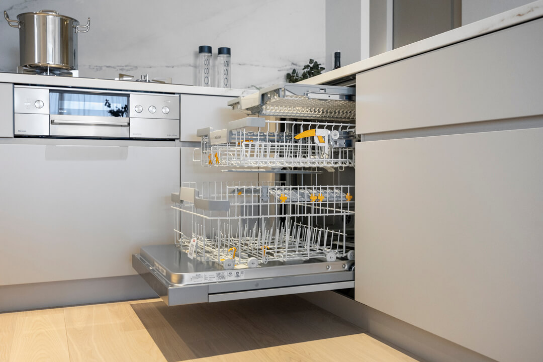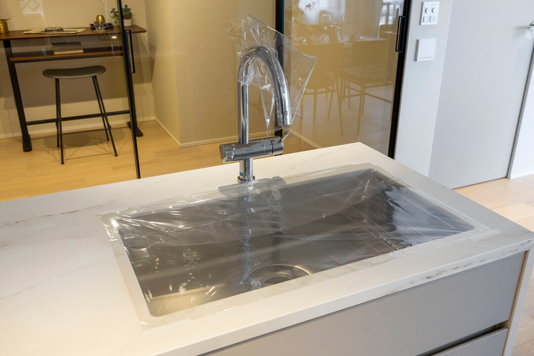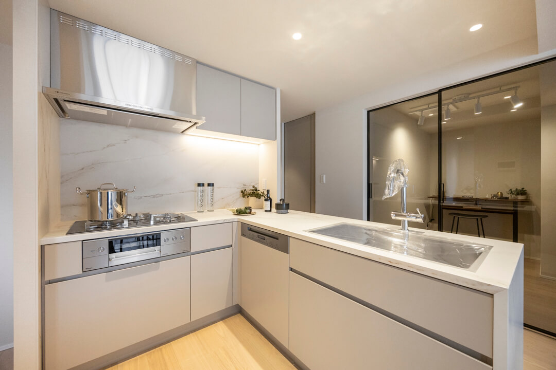 同時調理が叶う、グリル付3口ガスコンロを完備。耐久性・耐熱性に優れたガラストップ仕様です。容量の大きさが魅力的なMiele(ミーレ)製の食洗機も内蔵されていて、後片付けが捗ります。さらに、シンクには便利なディスポーザーを設置。料理後すぐに生ゴミを処理できるので、掃除の手間が軽減され、悪臭の原因を防いでくれます。