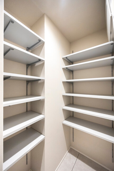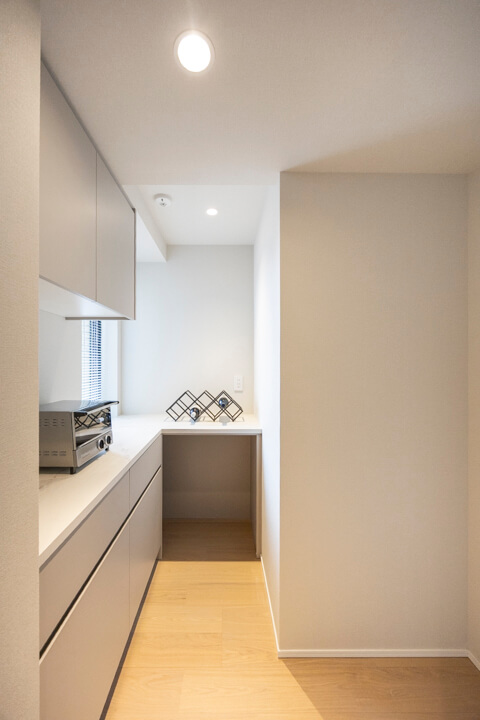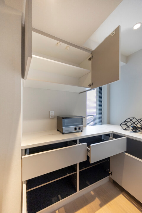 奥にはキッチンと同じデザインのカップボードを設置。食料品のストックや食器類を整理整頓でき、散らかりがちなキッチンまわりがすっきり片付きます。広々としたカウンターにはコンセントが付いていて、キッチン家電の使用や作業スペースとして活躍しそうです。