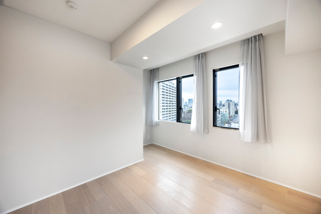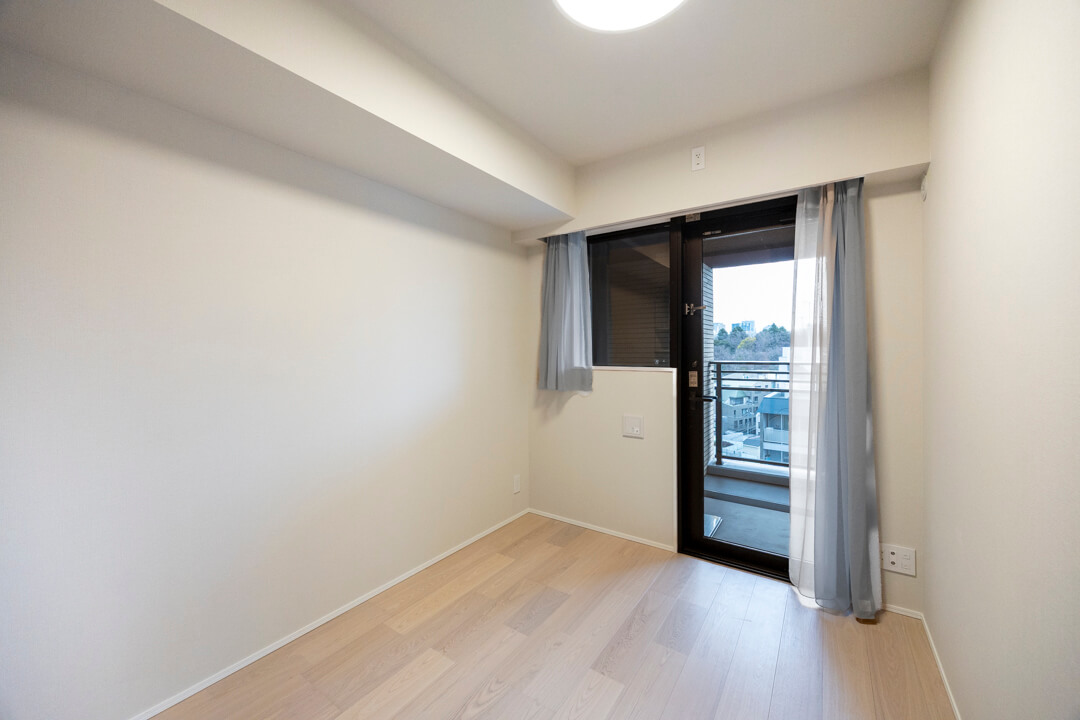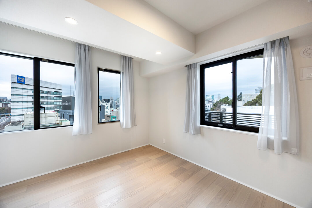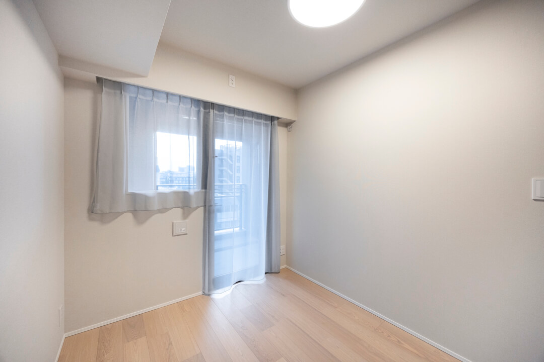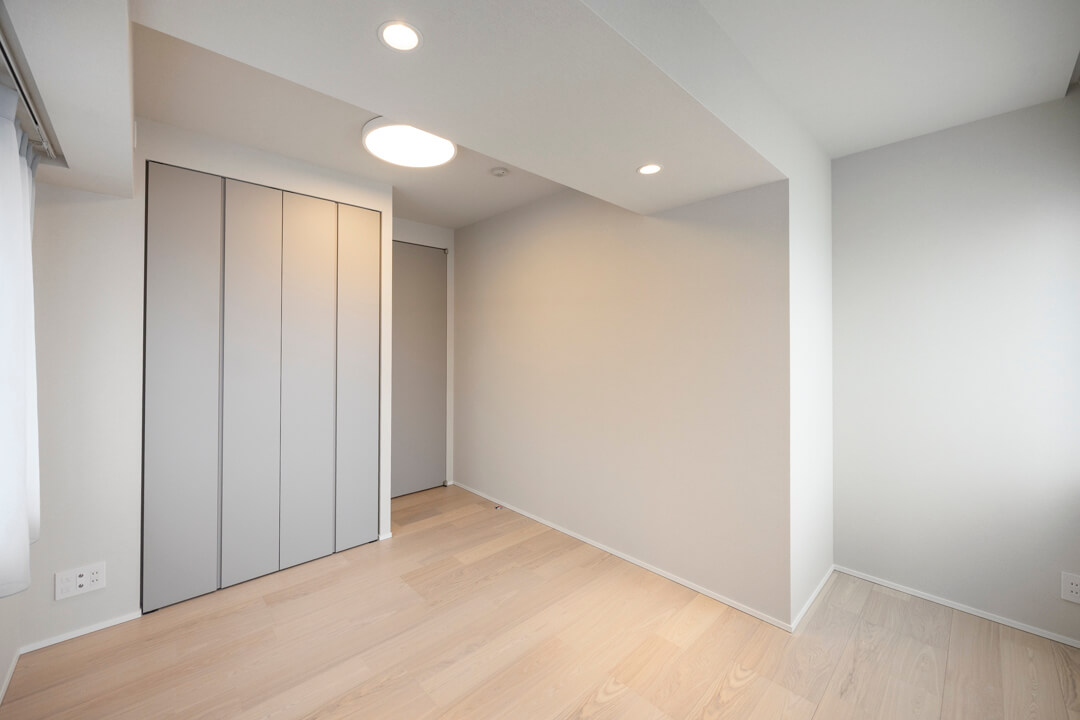 約6.7帖の洋室1。南西2面採光で日当たりが良く、心地よい風が通り抜けます。4枚折れ戸のクローゼット完備で収納スペースも豊富。主寝室にぴったりの空間です。