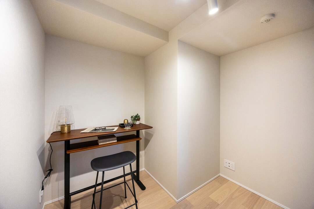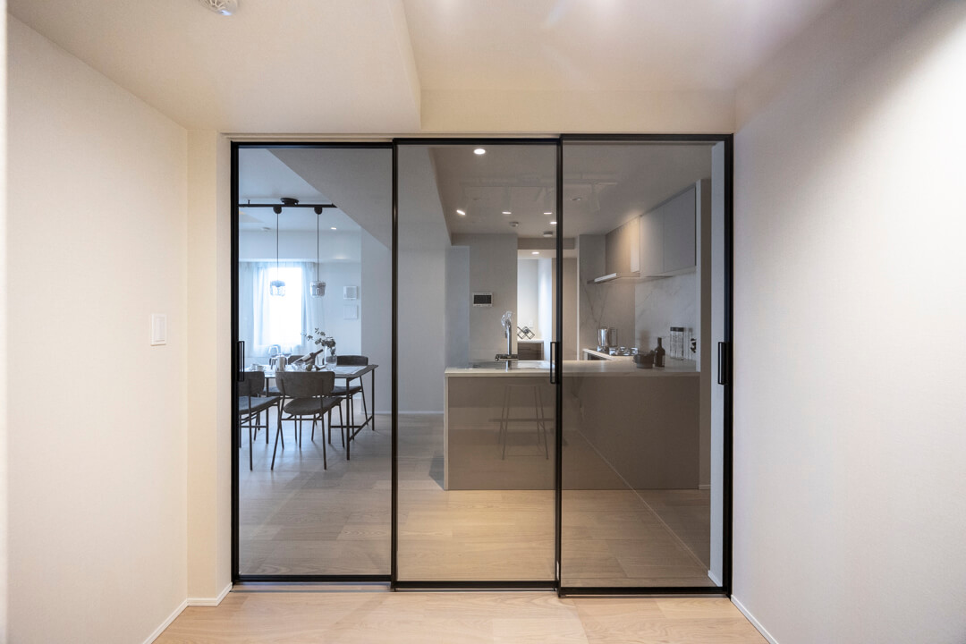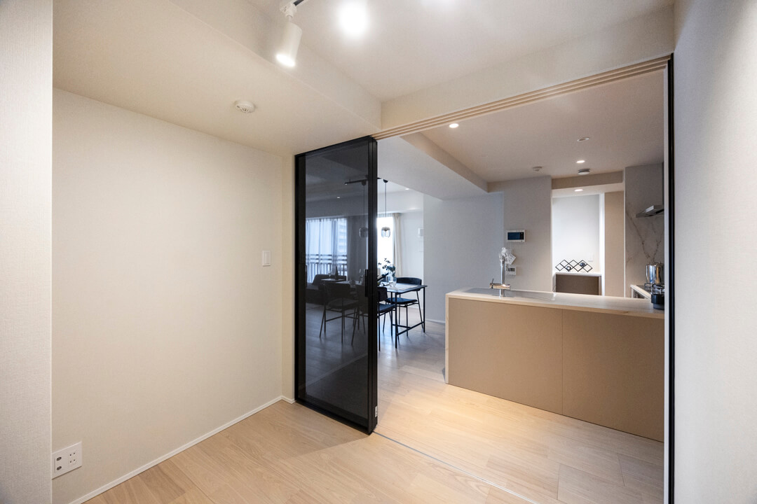 約3.8帖の洋室2。LDKとは引き戸で仕切られていて、フレキシブルに活用できる空間です。スタイリッシュなガラス扉でほど良いこもり感があるのもポイント。キッチンから様子が見える位置なのでお子さまのプレイルームにしたり、ワークスペースとしても活躍しそうです。