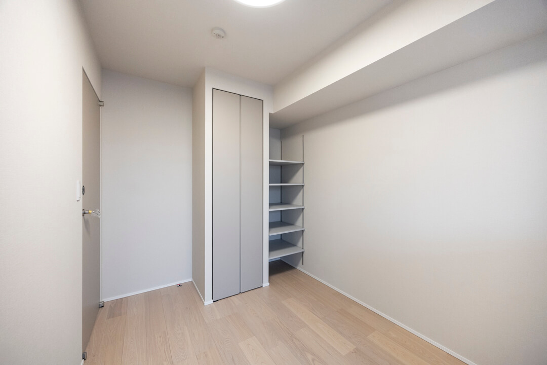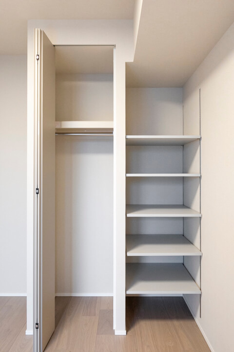 約5.0帖の洋室3。東向きバルコニーに面していて、明るい光が届きます。朝日を浴びてすっきり目覚められそうですね。クローゼット&可動棚完備で、収納スペースもしっかり確保◎。洋服や生活感の出る荷物はクローゼットに、お気に入りのコレクション品や本などは可動棚に、というように隠す収納と見せる収納の使い分けができます。
