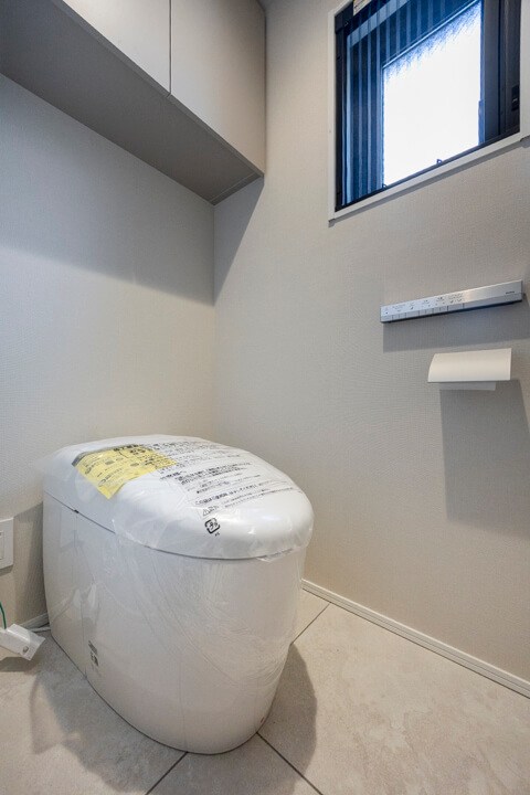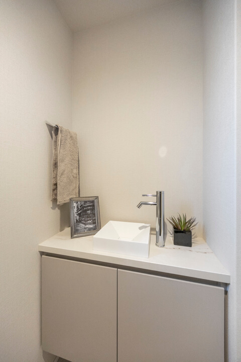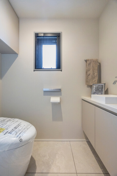廊下に面していて独立性の高いレストルーム。小窓から明るい光が入り、自然換気できるのが嬉しいポイントです。TOTO製のの洗浄便座付トイレに新規交換済み。手洗いカウンターが設置されているのですぐに手を洗うことができ、ゲストを洗面室まで案内する手間もかかりません。