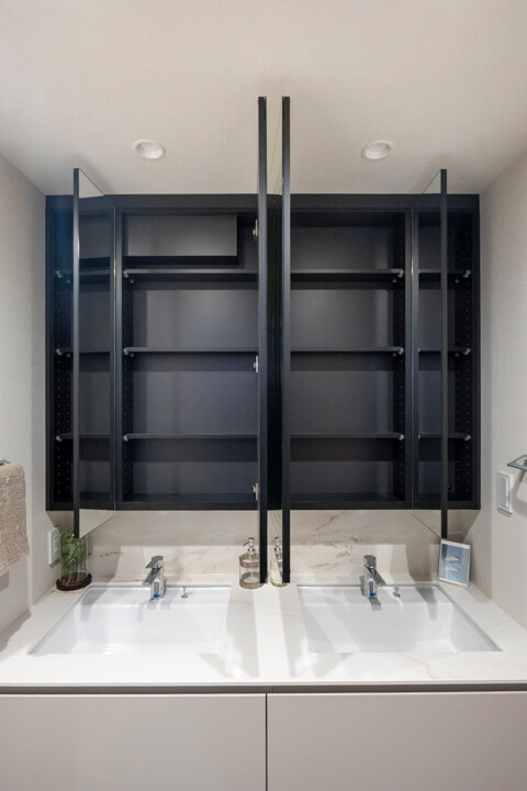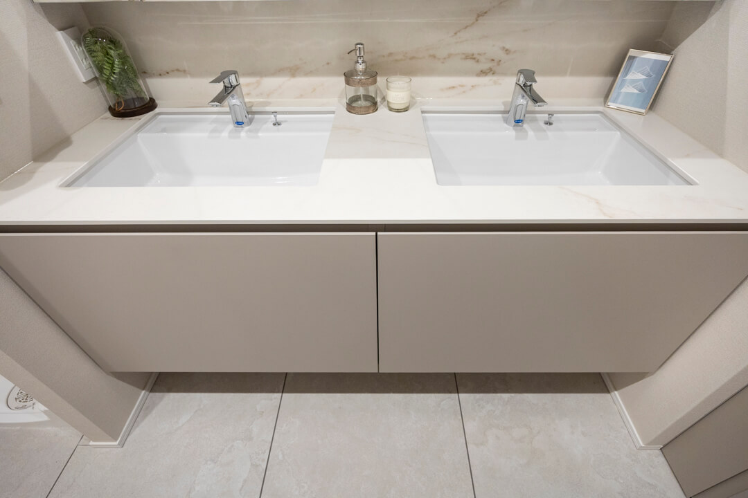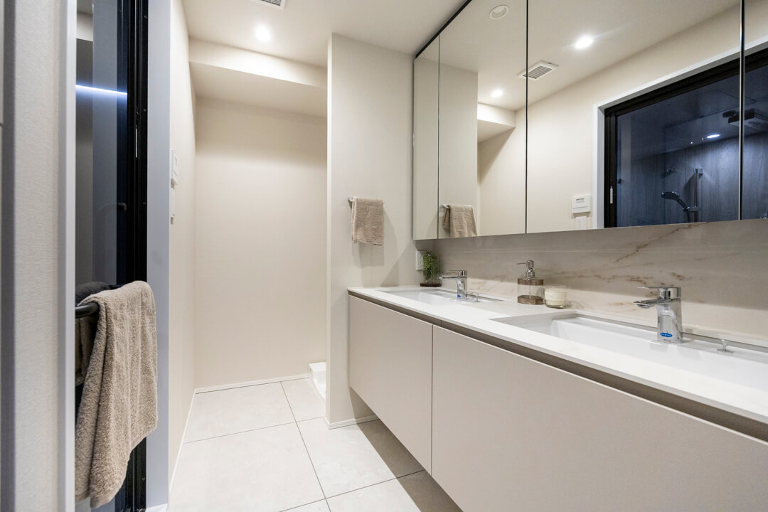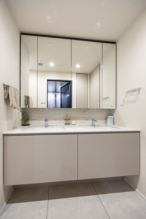 ホテルライクな2ボウルタイプの洗面化粧台。スタイリッシュなデザインの田中工藝製です。2人並んで使用でき、忙しい朝の身支度もスムーズに行えそうですね。洗面台本体の収納に加え、リネン庫も完備していて収納豊富◎。いつも清潔な洗面室をキープできそうです。