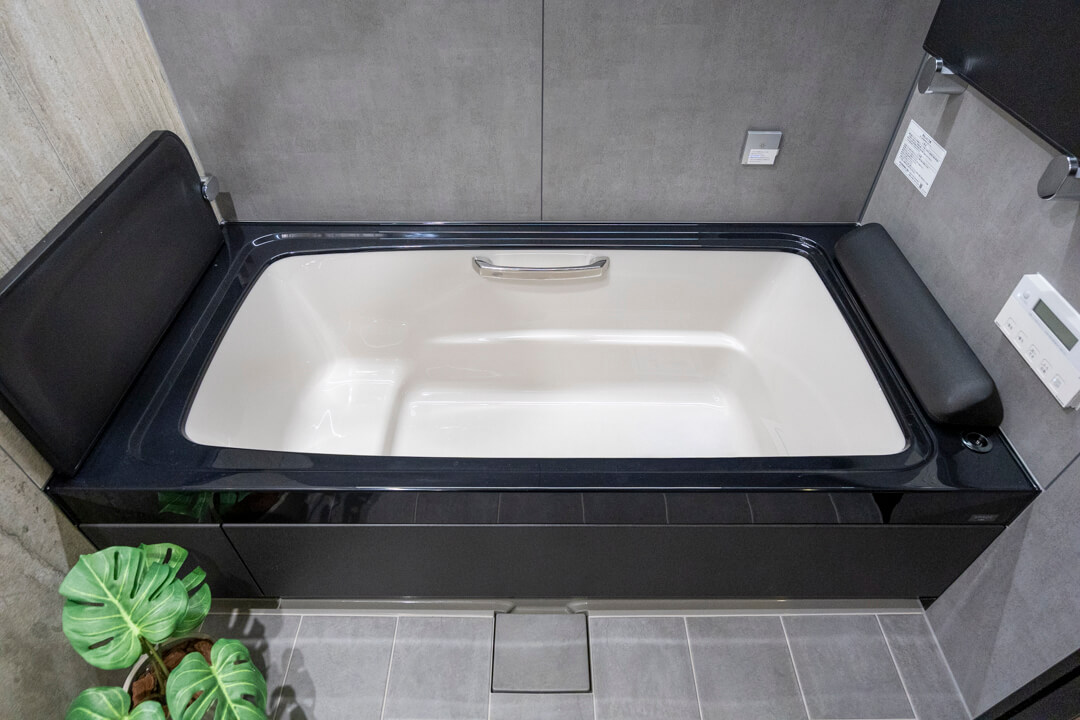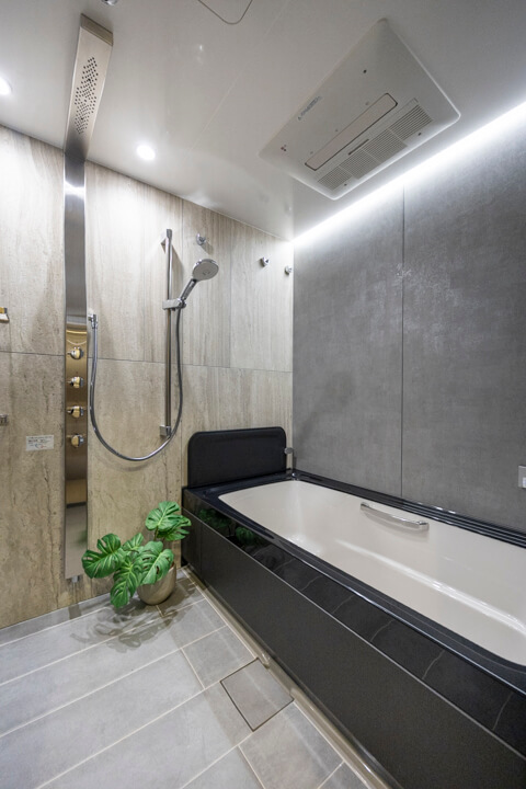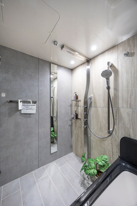 シックで落ち着いた印象のバスルーム。浴室換気乾燥暖房機・追い焚き機能に加え、ミストサウナも搭載されています。汗をかいてリフレッシュしたり、ゆっくりボディケアをしたり、快適なバスタイムを過ごせそうです。シャワーは2種類設置されていて、使い分けが可能。全身でシャワーを浴びることができるオーバーヘッドシャワーでは、高い保温効果が期待できます。