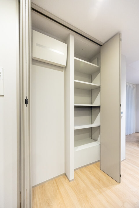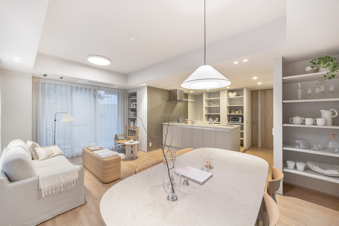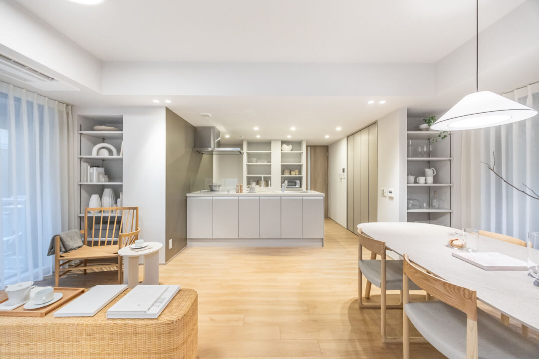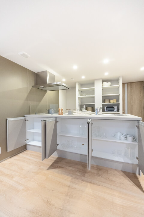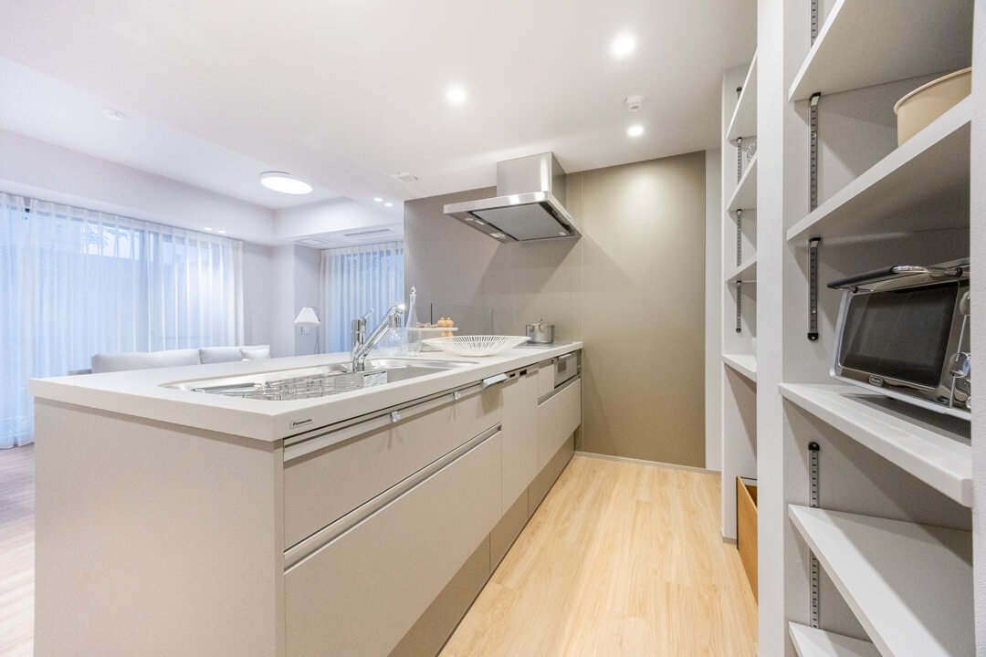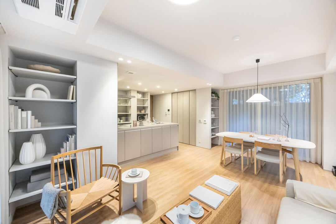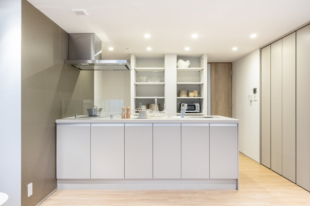 約19.8帖の広々としたリビングダイニングキッチンです。グレートーンでまとめられた落ち着きのある空間。可動棚には本を置いたり、お気に入りの小物などを飾ることができます。また、生活感が出がちな小物を収納できる棚も造られています。エアコンは埋め込み式のため、インテリアの邪魔をしないのもポイント。