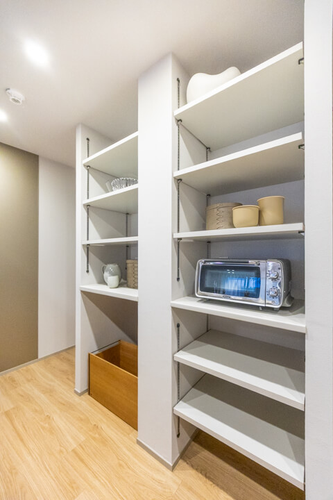 背面側には可動棚が設置されています。高さを調節して、家電や食器、ストック類などを配置することができます。