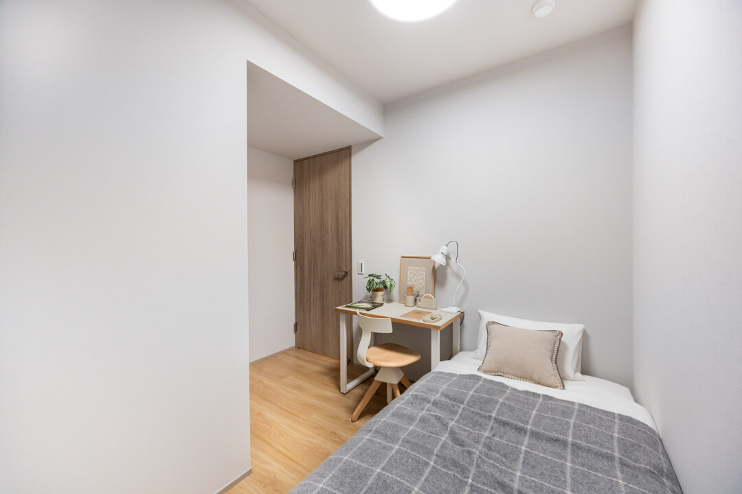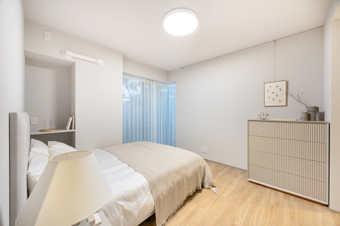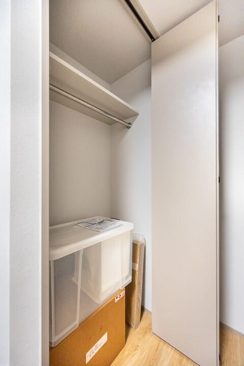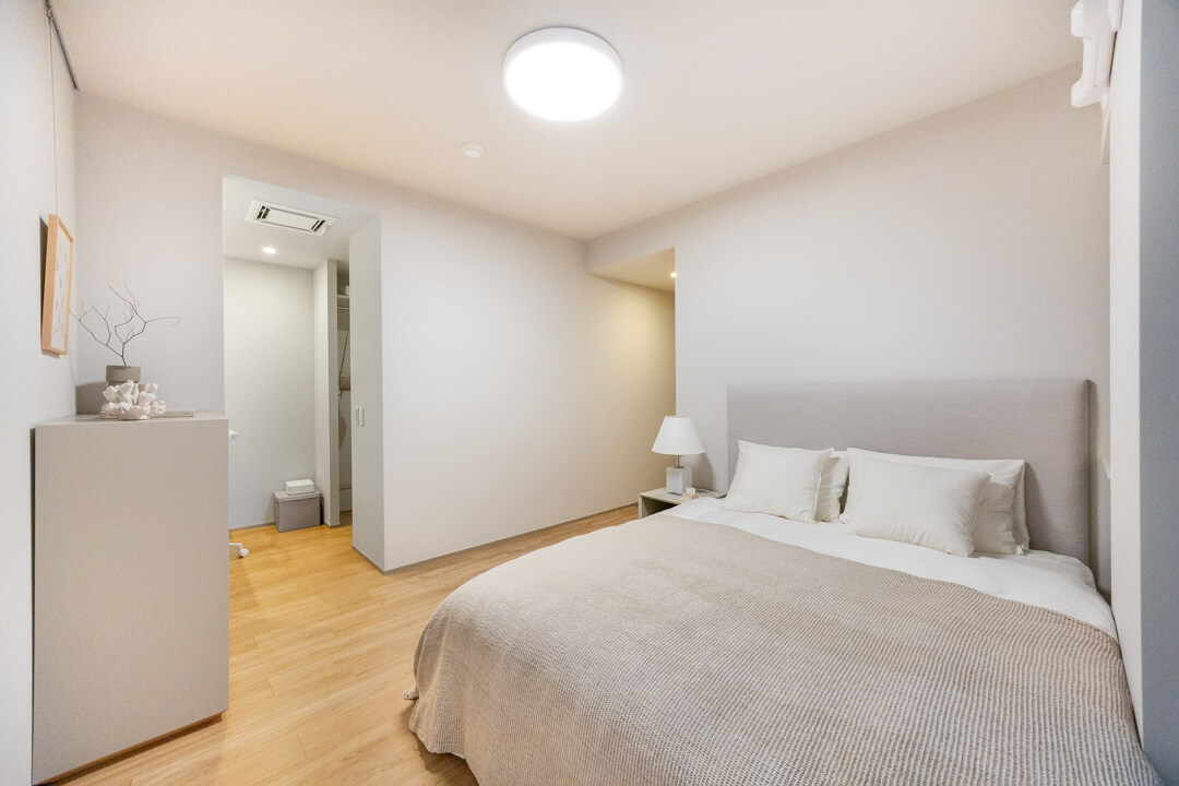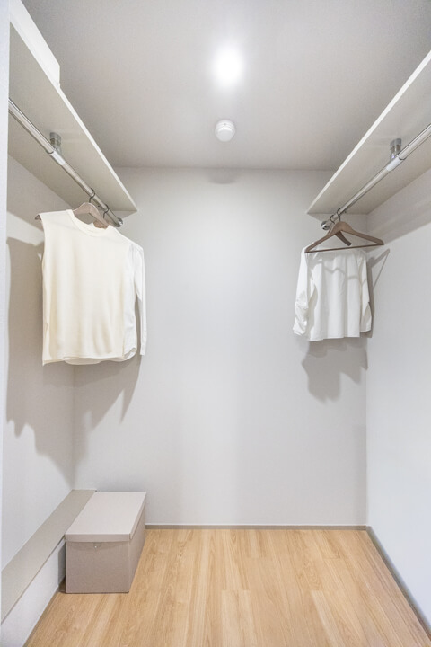約10.1帖のゆとりがある寝室1は主寝室に良さそうなお部屋です。壁面にはピクチャーレールが設置されているので、壁を傷つけずに絵画などを飾ることができます。また、奥行きがあるウォークインクローゼット付きのため、洋服や大きめの荷物もすっきりと収納が可能。さらに、その前にあるスペースは、リモートワークやパウダールームなど色々な使い方ができます。