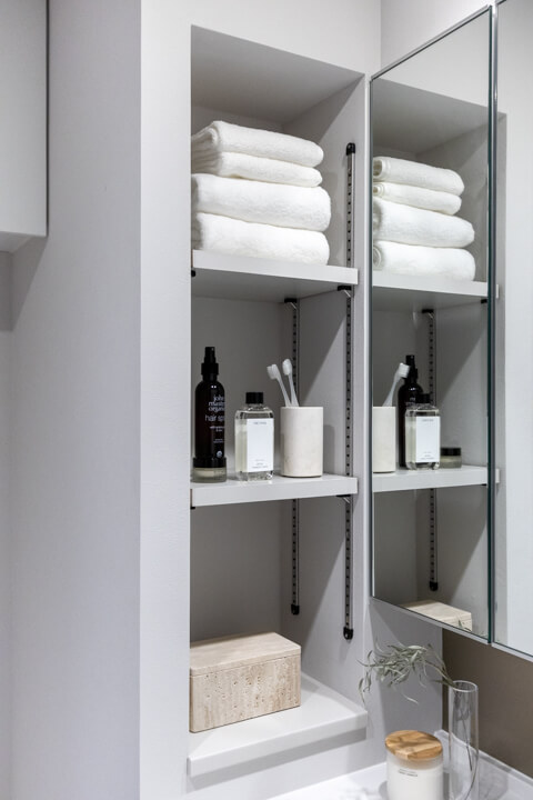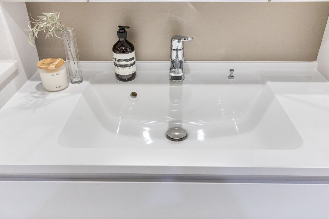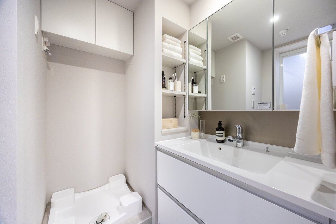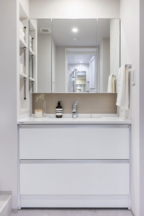白を基調とした清潔感のある洗面化粧台はPanasonic製。洗面ボウルとカウンターは一体型のためお手入れがしやすくなっています。また、三面鏡の中や横の可動棚には化粧品などの小物が収納できて使い勝手良好です。