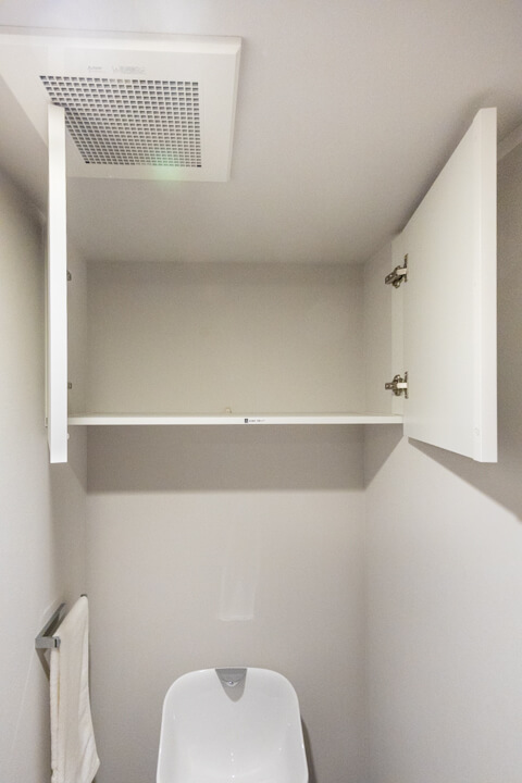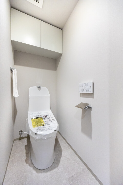 ウォシュレット一体型トイレです。上部には吊戸棚が設置されているので、トイレットペーパーや掃除用具などを収納できます。