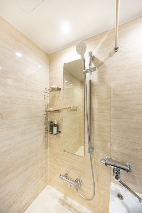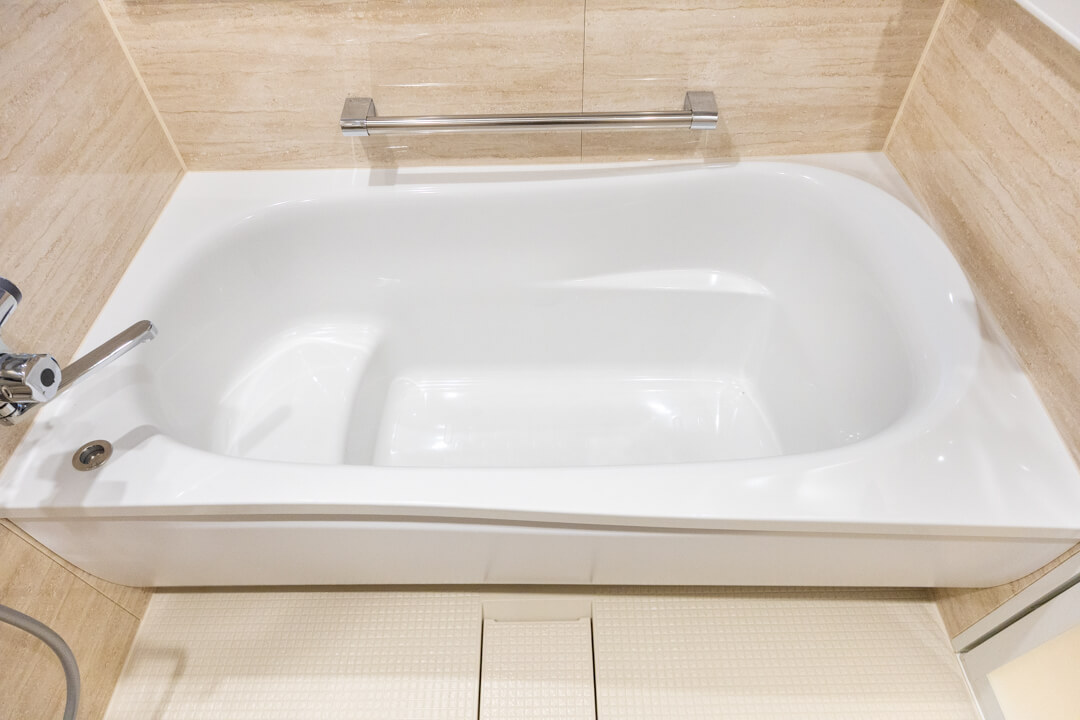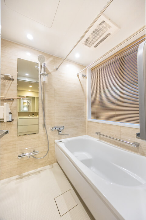 1416サイズのバスルームは、大きな窓が特徴的。浴槽はベンチ浴槽になっているので、半身浴などもしやすくなっています。また、浴室乾燥機には暖房・乾燥・換気・涼風の機能がついており、一年中快適に過ごすことができますよ。