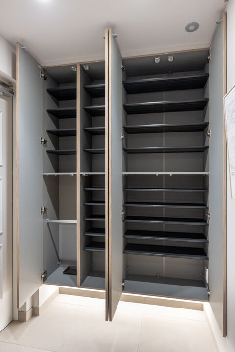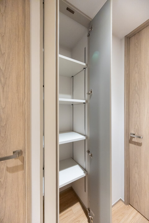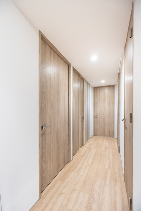 玄関はゆったりとした空間で、荷物を持っていても出入りがしやすそうです。また、シューズボックスは高さがありますが、フロートタイプのため空間に圧迫感を与えません。フットライトの光が優しく足元を照らしてくれますよ。正面の壁にはお気に入りの絵画などが飾れるピクチャーレールが設置されています。また、廊下にも収納スペースが造られていて◎。