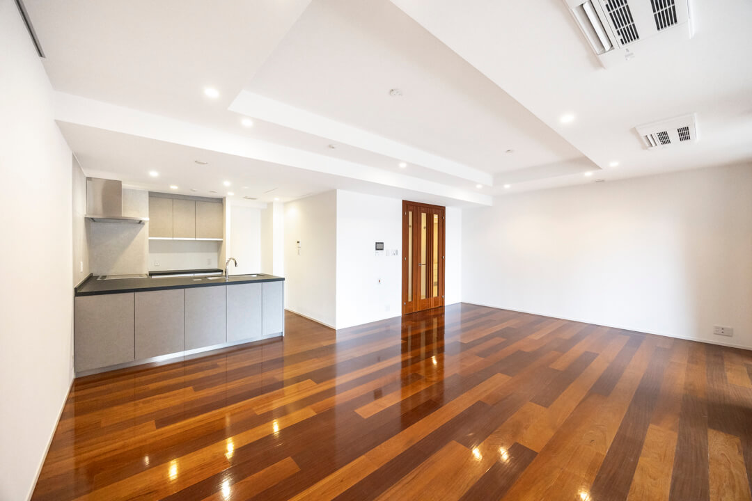 約23.8帖の広々としたリビングダイニングキッチンです。大きめの家具も配置できるので、家具選びが楽しみになりそうですね。また、壁面にはピクチャーレールが設置されており、壁を傷つけずに絵画などを飾ることができます。エアコンは埋め込み式のため、お部屋の雰囲気を壊さないのも◎。
