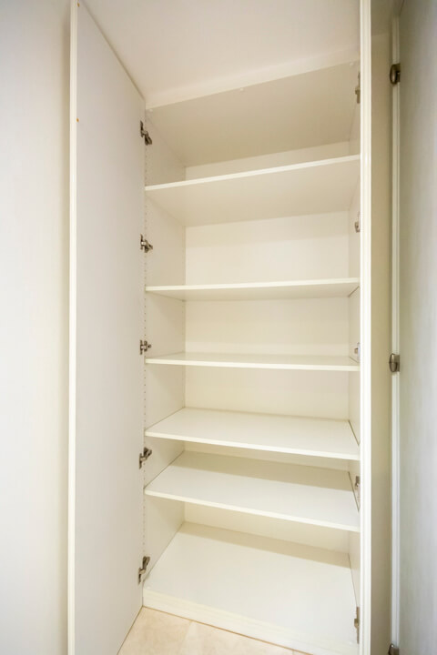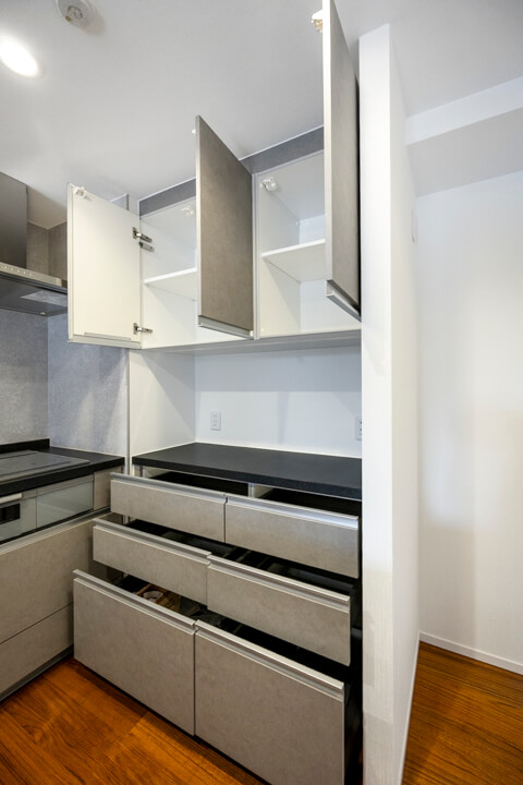 キッチンの背面側にはカップボードが備え付けられています。調味料や食器などを収納できるだけでなく、電子レンジなどを置くこともできるので便利です。