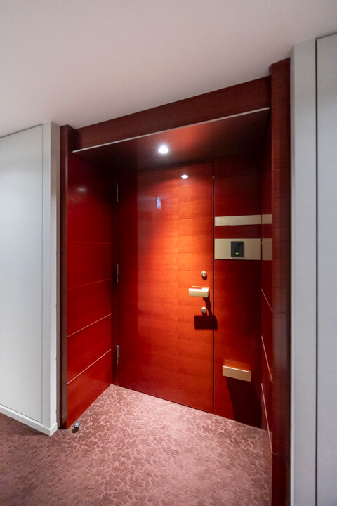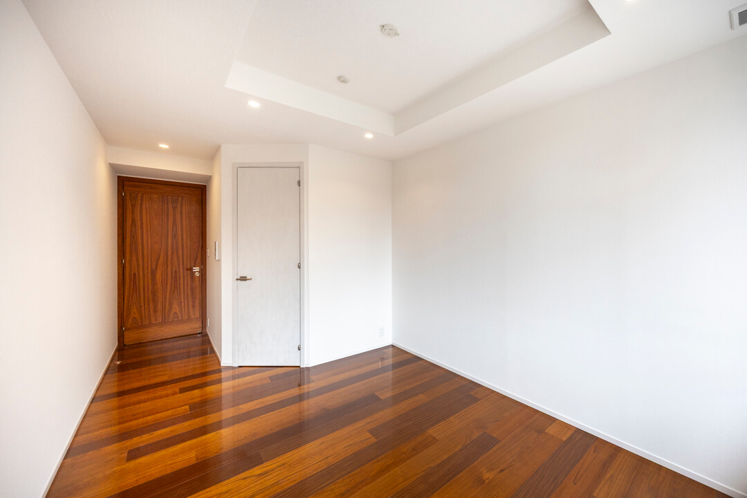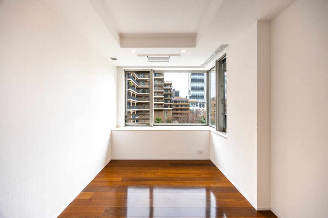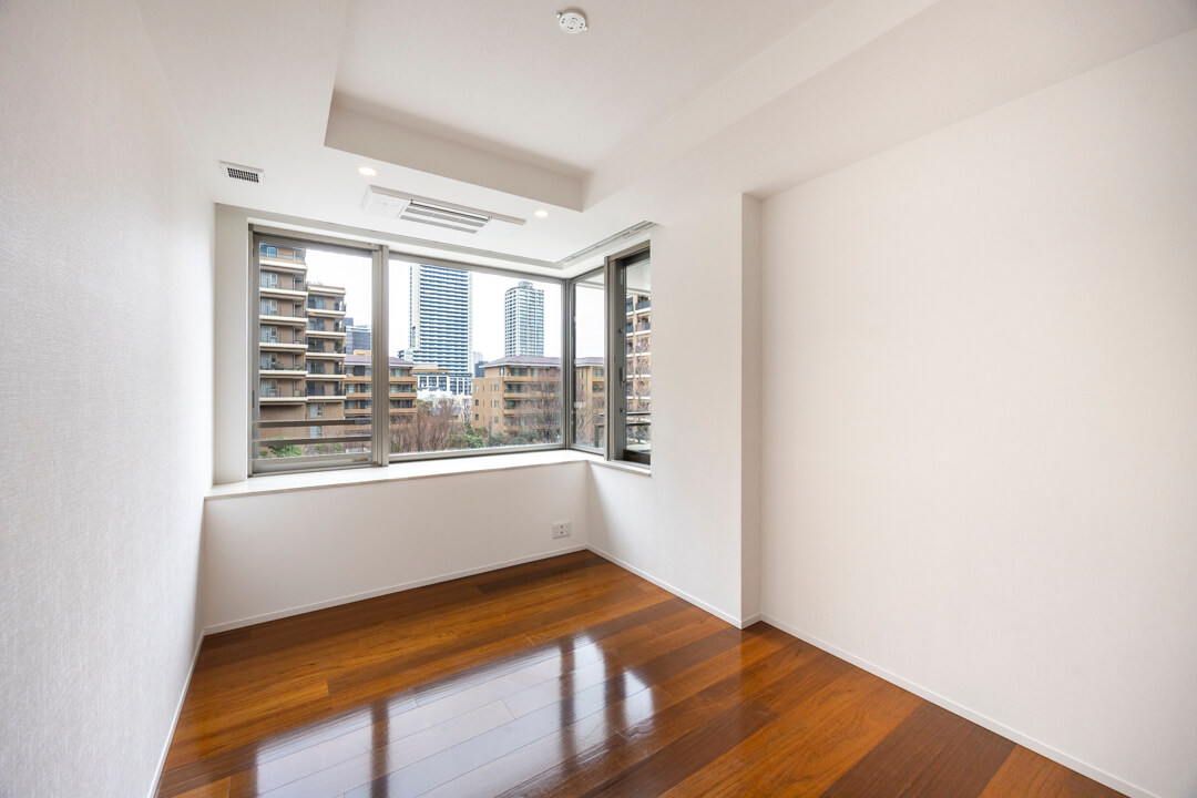 約9.0帖のゆとりがある寝室です。L字の窓からは敷地内にある中庭を望むことができますよ。また、奥行きがあるウォークインクローゼットが付いています。洋服や大きめの荷物もしっかりと収納できて便利。