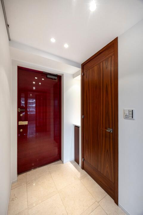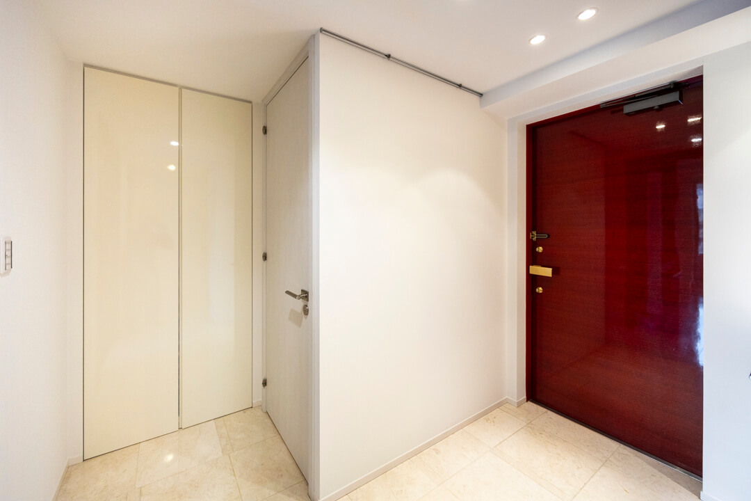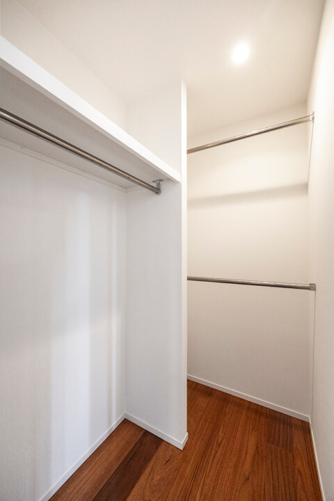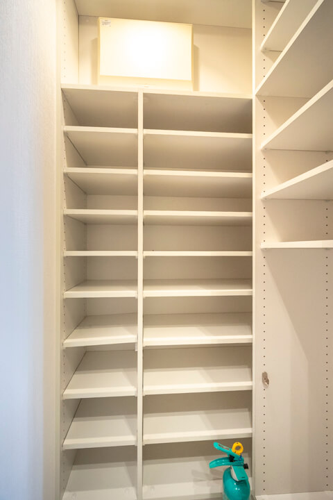 モダンな雰囲気が漂う玄関には、シューズインクローゼットが造られています。中には可動棚が付いているので、持っている靴に合わせて調節ができますよ。さらに、傘立てスペースもあって便利です。また、廊下にも生活感が出がちな小物を収納できる棚が設置されています。