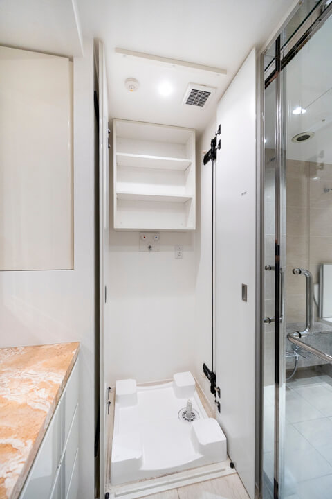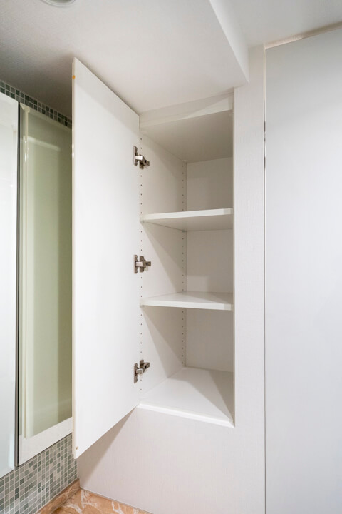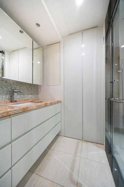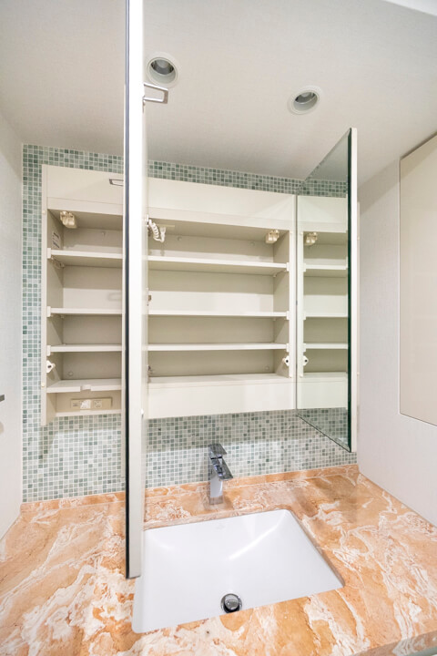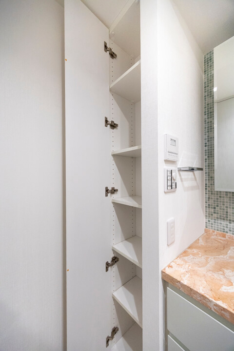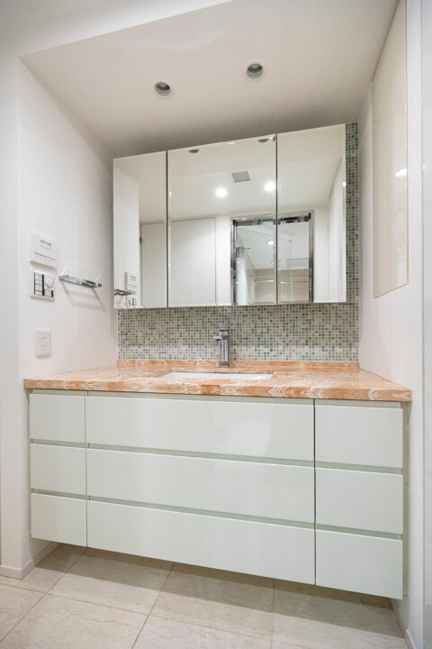 タイルや石目調のカウンターがアクセントになっている洗面化粧台です。三面鏡や壁面にある棚には化粧品などが収納できて使い勝手良好。さらに、横にも棚が造られているので、リネン類などもすっきりと収納できます。