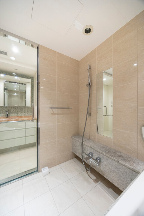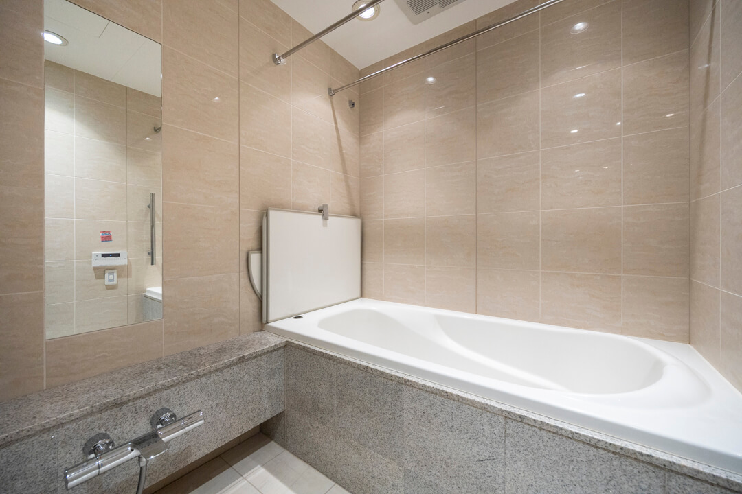高級感が漂うバスルームです。お風呂にゆっくり浸かるのが好きという方に嬉しい追い焚き機能を搭載。家族の入浴時間がずれてしまっても安心です。また、浴室乾燥機には暖房・乾燥・換気・涼風の機能がついており、一年中快適に過ごすことができます。