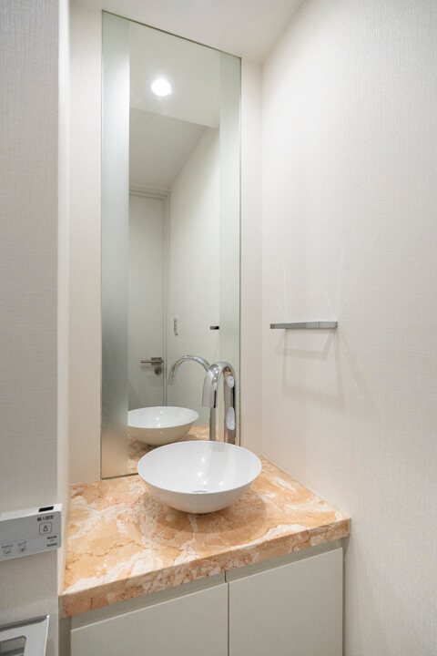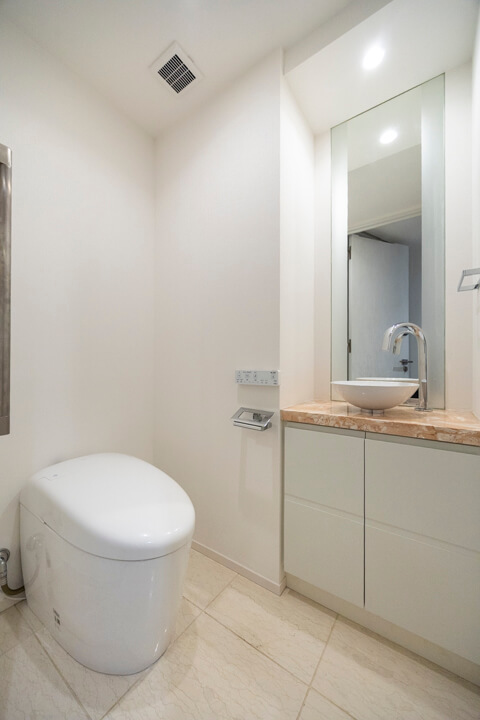 ウォシュレット一体型のトイレです。タンクレスタイプなのですっきりとした印象に。また、別途で手洗い器と鏡が造られているので、その場でサッと身だしなみを整えることができます。