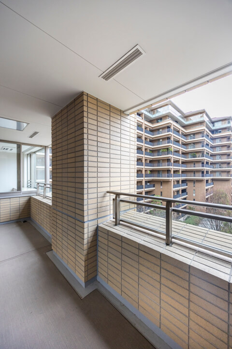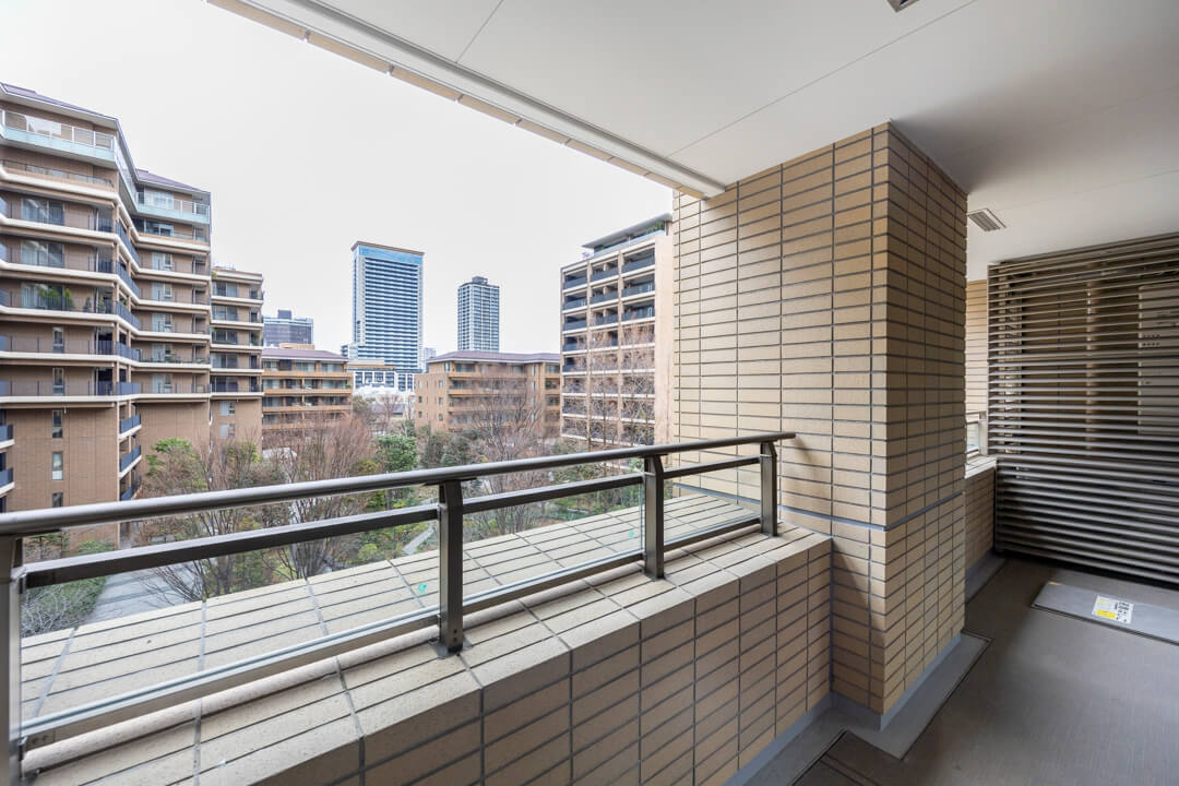 約10.98㎡のゆったりとしたバルコニーです。チェアなどを置いてほっと一息ついても◎。また、目の前には中庭が広がり、外部からの視線は気になりにくくなっています。