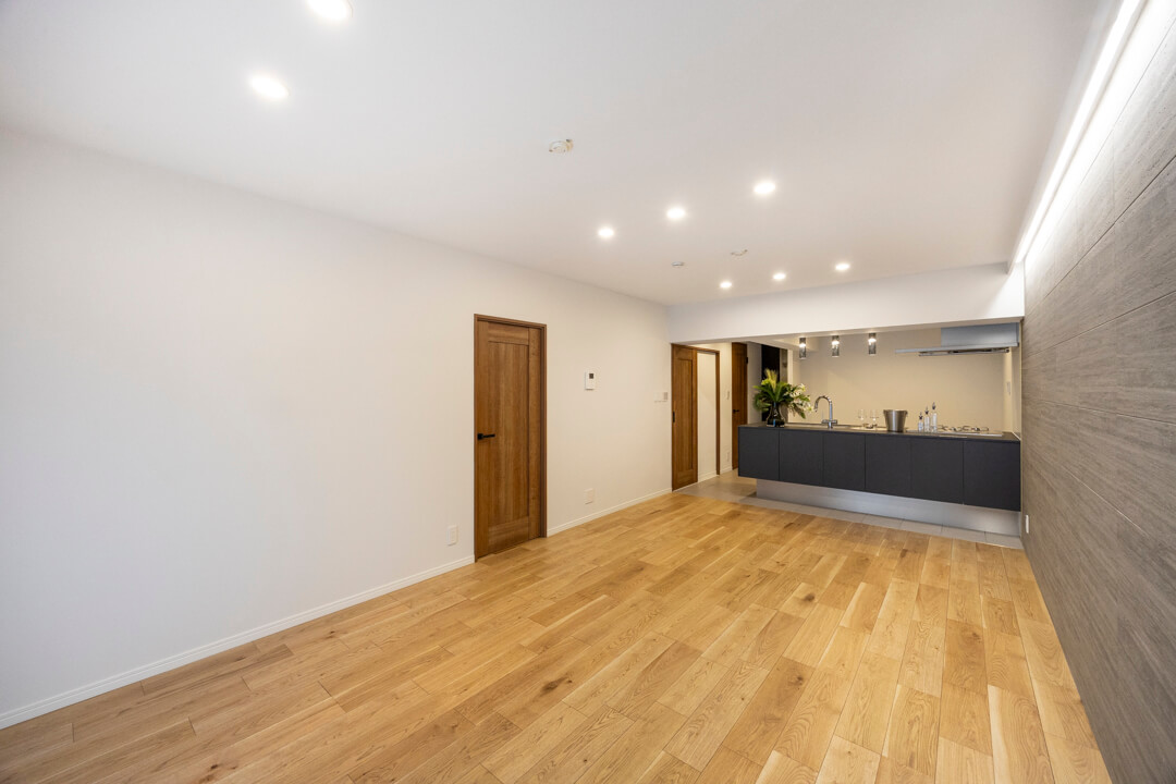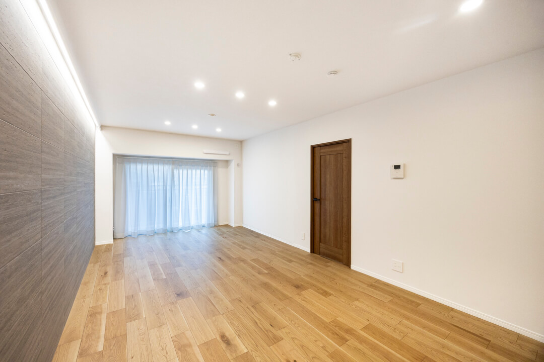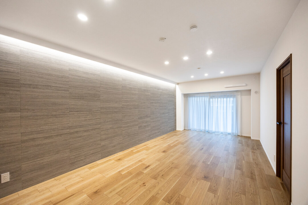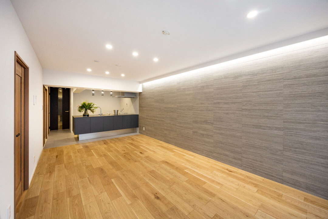 約18.3帖の広々としたLDK。南西向きの大きな窓から明るい光がたっぷり届きます。温もりある木目フローリングに石調のアクセントウォールが映え、上質な空間を演出。間接照明が立体感を強調し、暮らしの中に新しい表情をつくりだします。