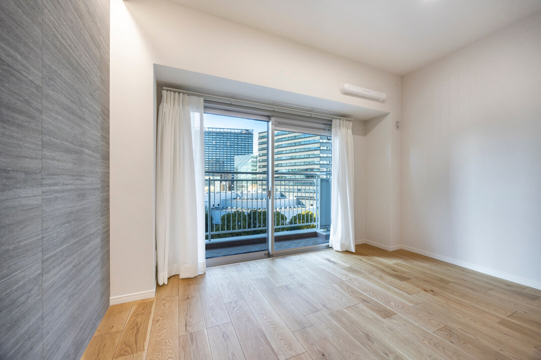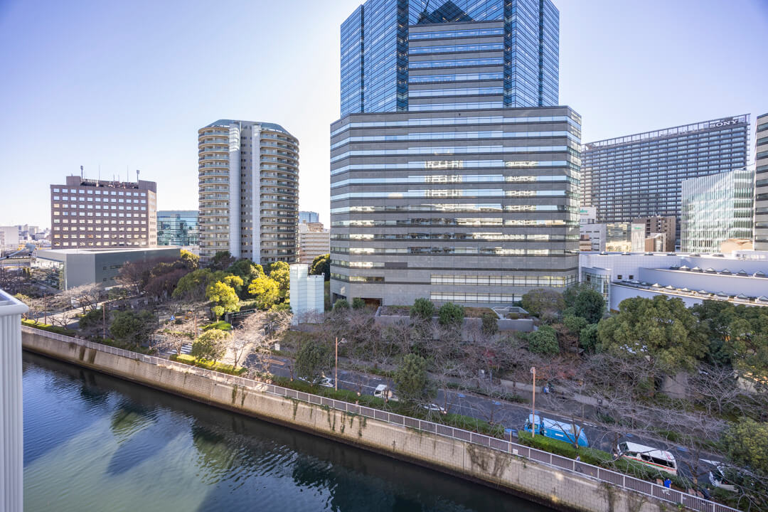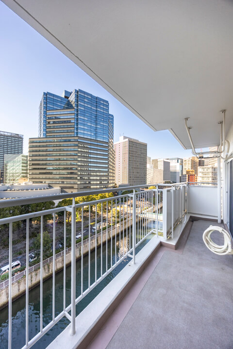 LDKと洋室3に跨るバルコニーは7.68㎡。9階南西向きにつき、日当たりと眺望に恵まれています。澄んだ青空と目黒川を望む、開放感あふれるリバービューが広がり、季節の移ろいを身近に感じることができます。春には桜並木が彩りを添え、窓辺からの景色にも趣をもたらします。室外機は天吊り設置が可能で、バルコニースペースを有効に使える点も魅力です。