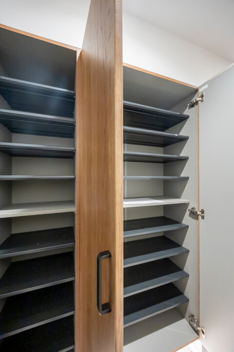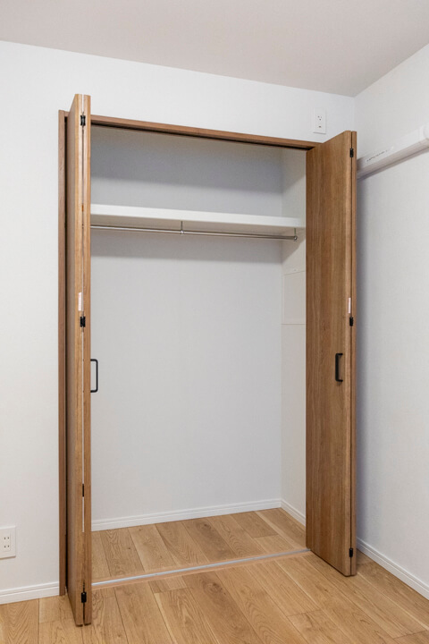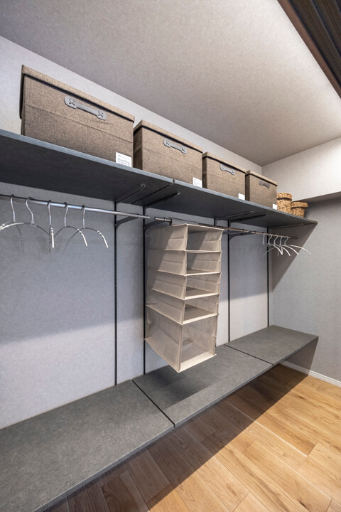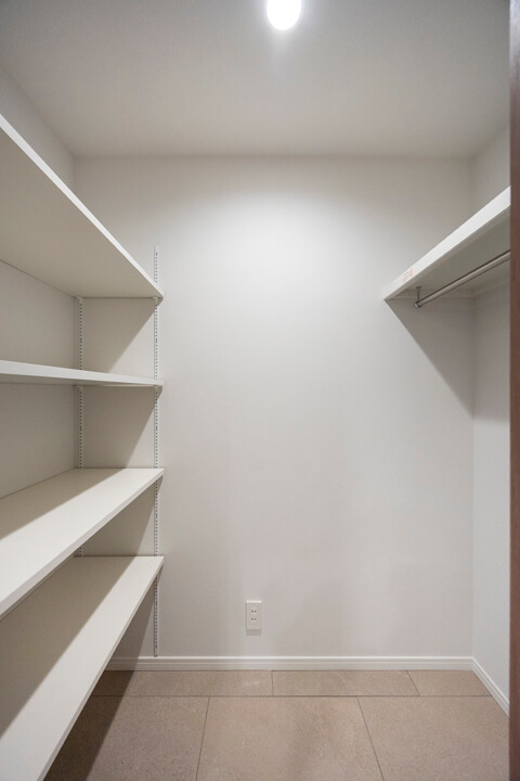 LDKに入ってすぐ右手には納戸を完備。中にはハンガーパイプと可動棚が設置されています。日用品ストックや掃除機などの大きな荷物、コート類も収納でき、すっきりとした居住空間を実現できそうです。