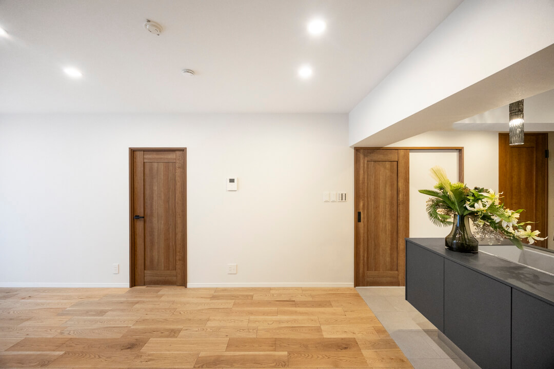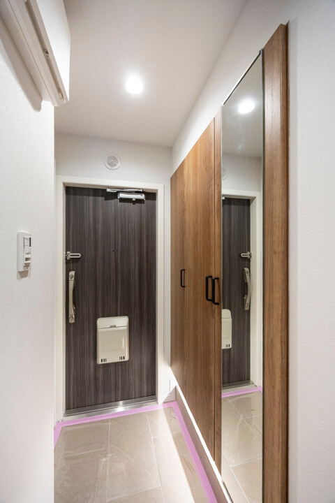 フットライトの明かりが足元を幻想的に包み込む玄関。収納力のあるシューズボックスを完備していて、いつも清潔な空間をキープできそうです。扉の一部が鏡張りになっているので、靴を履いた状態でコーディネートチェックできるのも嬉しいポイントです。