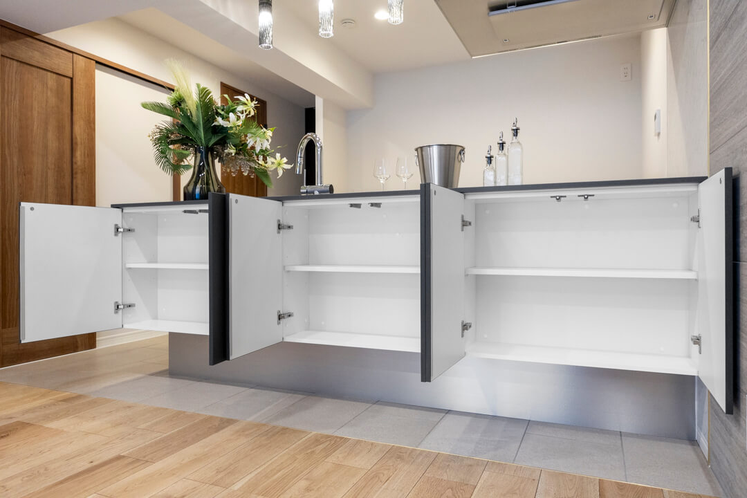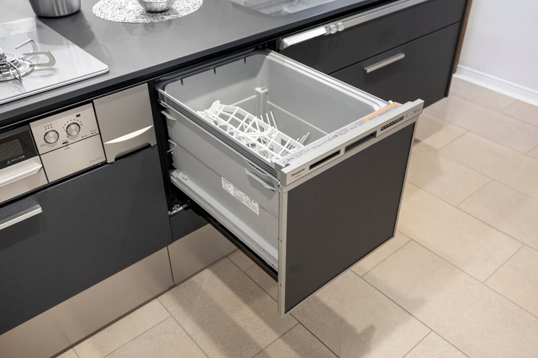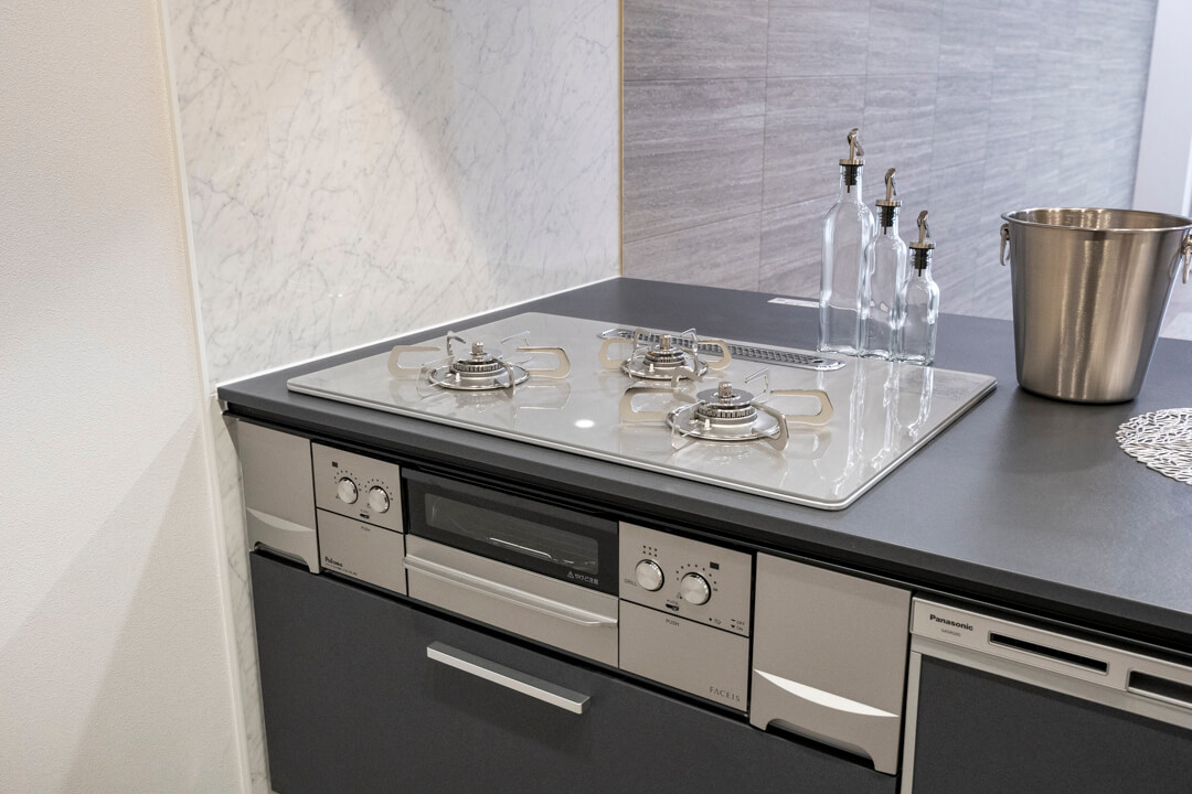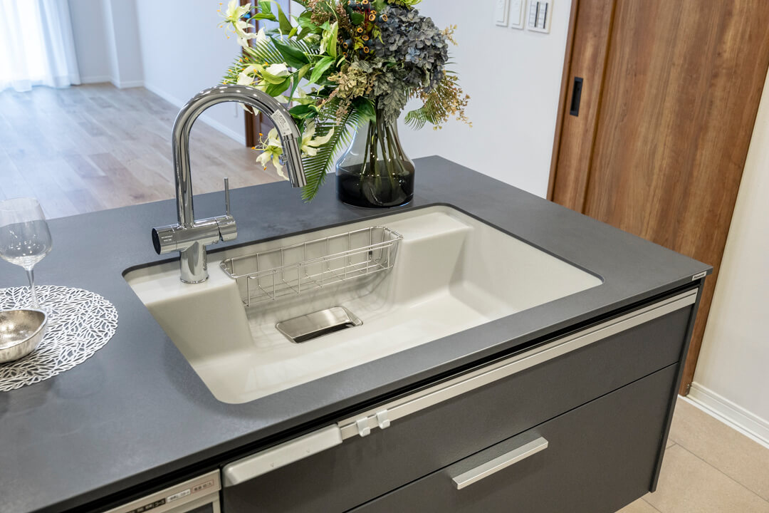 調理の際に手軽においしい水を使用できる浄水器内蔵センサ-水栓や、後片付けの捗る食洗機付き。グリル付3口ガスコンロも付いていて、快適な家事時間をサポートしてくれます。「ラクするーシンク」は隙間レスで汚れにくく、お手入れのしやすさが魅力です。