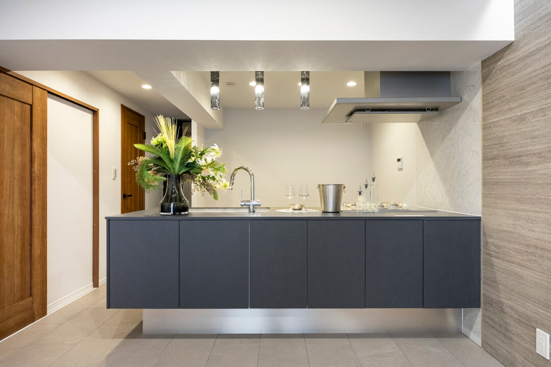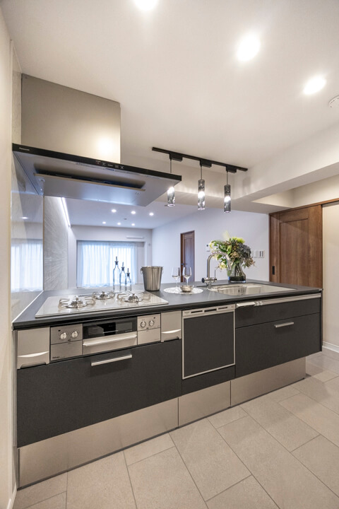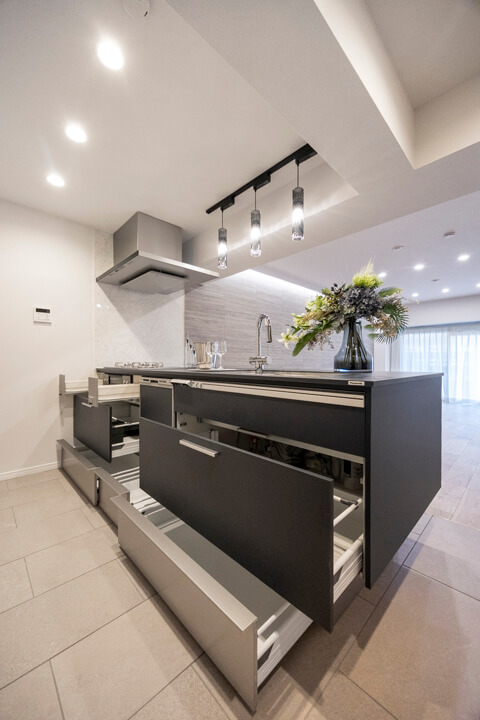 ブラックトーンでスタイリッシュなキッチン。Panasonic製のSクラスを採用しています。リビングダイニングを見渡せる開放的な対面タイプで、家族やゲストとの会話を楽しみながら調理ができます。楽しいキッチン時間になりそうですね。