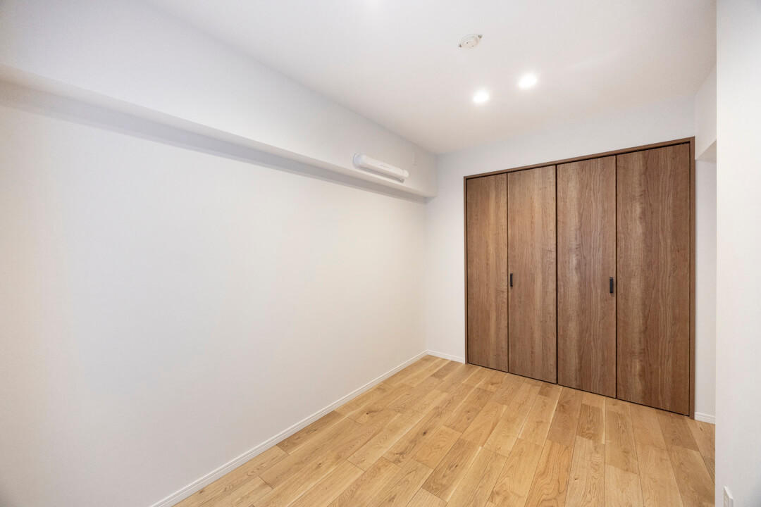 約5.0帖の洋室1。やわらかな光が入る北東向きです。4枚折れ戸のクローゼット完備で収納力◎。荷物をすっきり収納し、居室部分を有効活用できそうです。