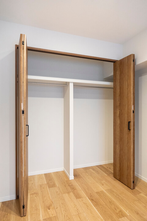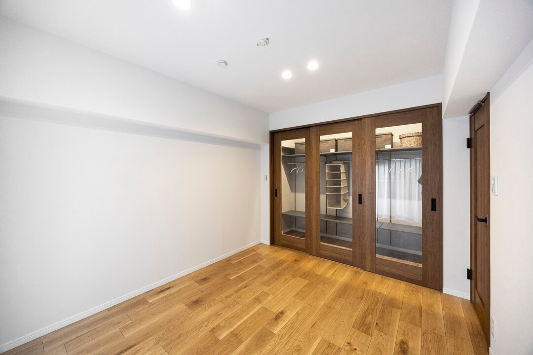 LDKに隣接する約6.6帖の洋室3。南西向きバルコニーに面していて、明るい光が届きます。対面側には収納力のあるクローゼットを設置。木目フレームのクリア仕様で、スタイリッシュな印象です。どこに何があるかがひと目でわかるので、コーディネートの時短になりそうですね。