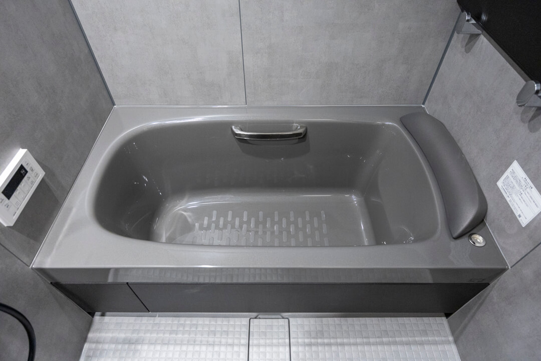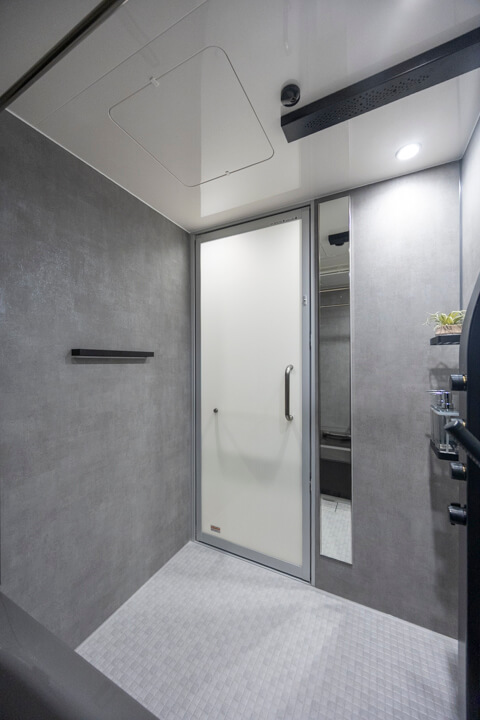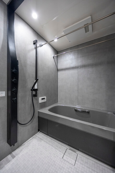 グレートーンでシックな印象のバスルーム。LIXIL製のPXスパージュ、1418サイズです。浴室乾燥暖房機・追焚機能搭載で1年中快適なバスタイムをお過ごしいただけます。シャワーは2種類設置。全身でシャワーを浴びることができるオーバーヘッドシャワーでは、高い保温効果が期待できますよ。用途によってハンドシャワーと使い分けてくださいね。