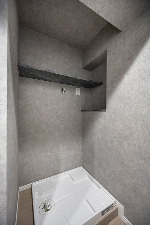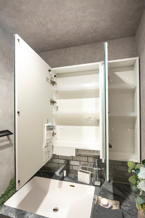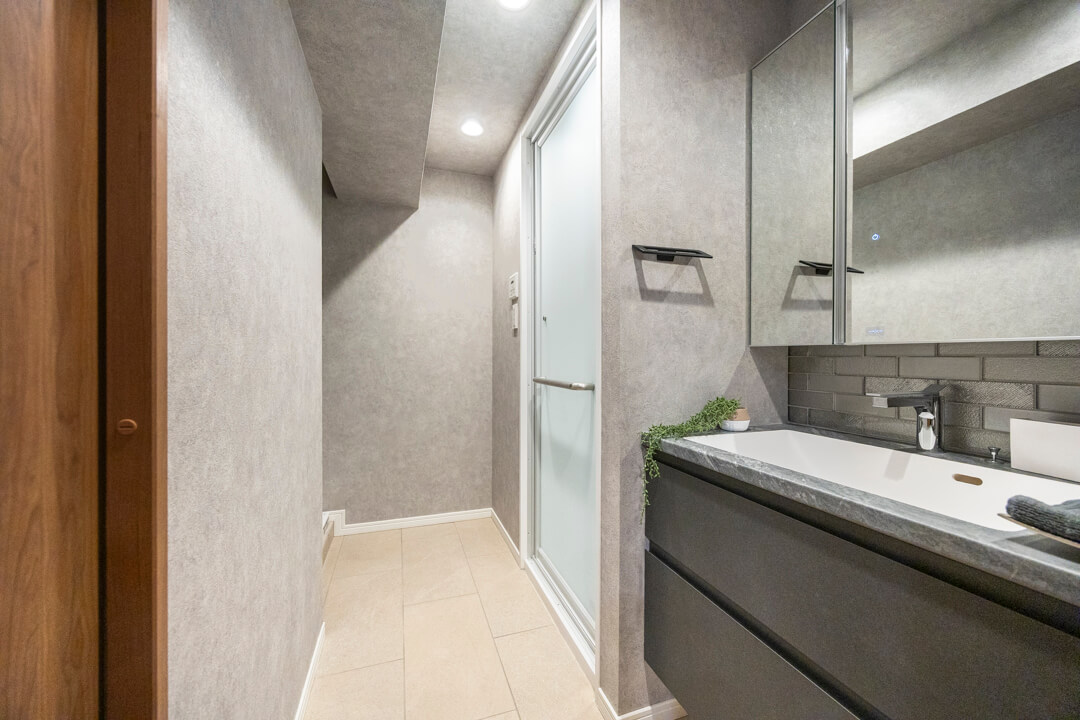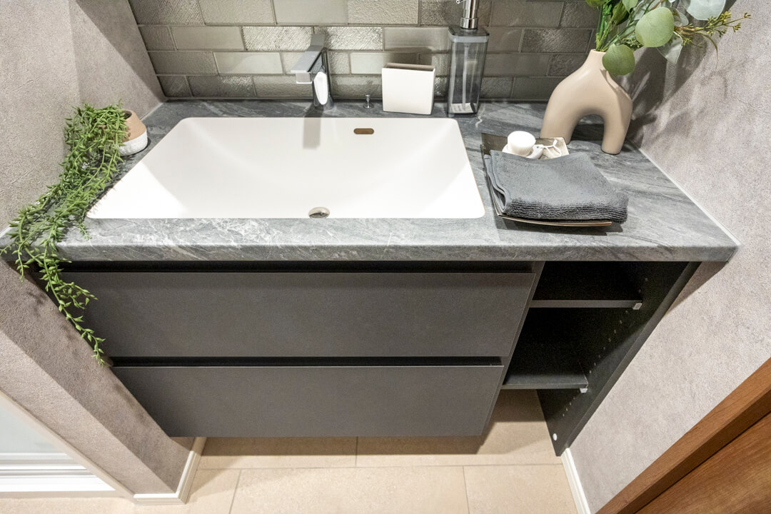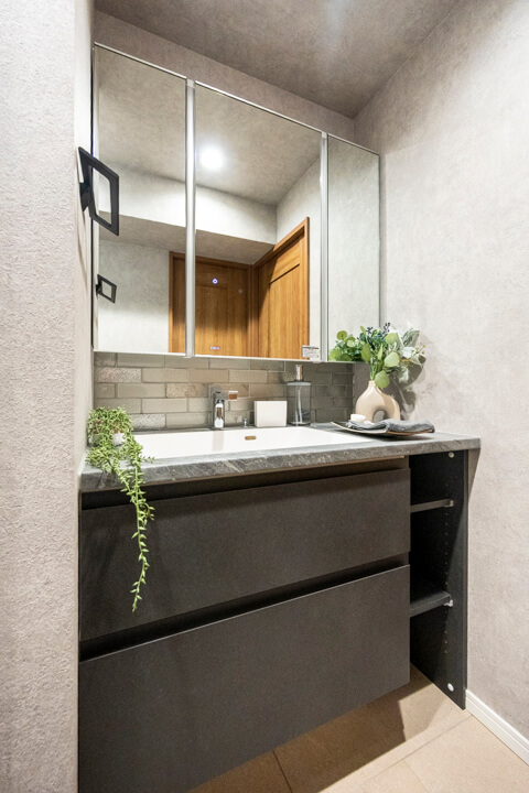 レンガ調のバックガードや石柄カウンターが洗練された雰囲気を演出する洗面化粧台。顔全体をしっかり照らしてくれるツインライン照明は、タッチレス仕様で衛生的です。洗面ボウルが片側に寄せられていて、カウンタースペースが広く確保されているのも嬉しいポイント。化粧品やドライヤーの仮置きができ、忙しい朝の身支度がスムーズに行えそうです。